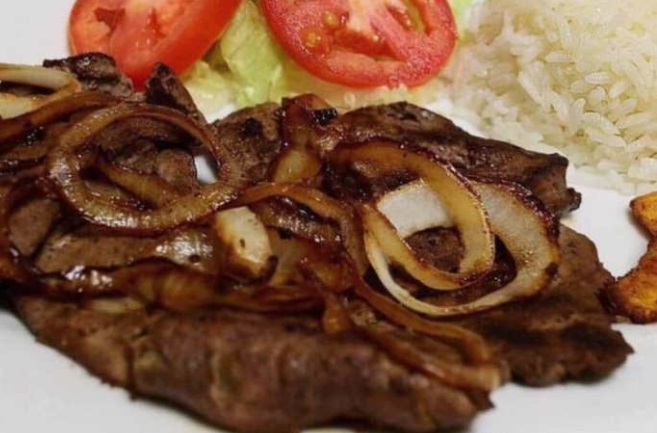 Fruta del día o sopa del día, arroz, principio arveja o ensalada (lechuga, tomate y cebolla o zanahoria, espinaca y pepino), hígado encebollado y jugo del día.