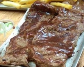 Churrasco con papa a la francesa, tajada de plátano y tajada de aguacate.