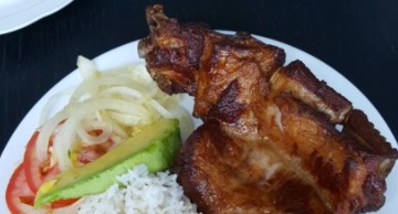 Bandeja mixta (carne de cerdo, pechuga y carne de res con papa a la francesa, tajada de plátano y tajada de aguacate.