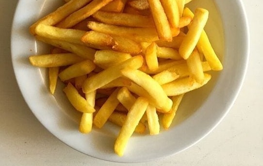 Mojarra con papa a la francesa, tajada de plátano y tajada de aguacate.