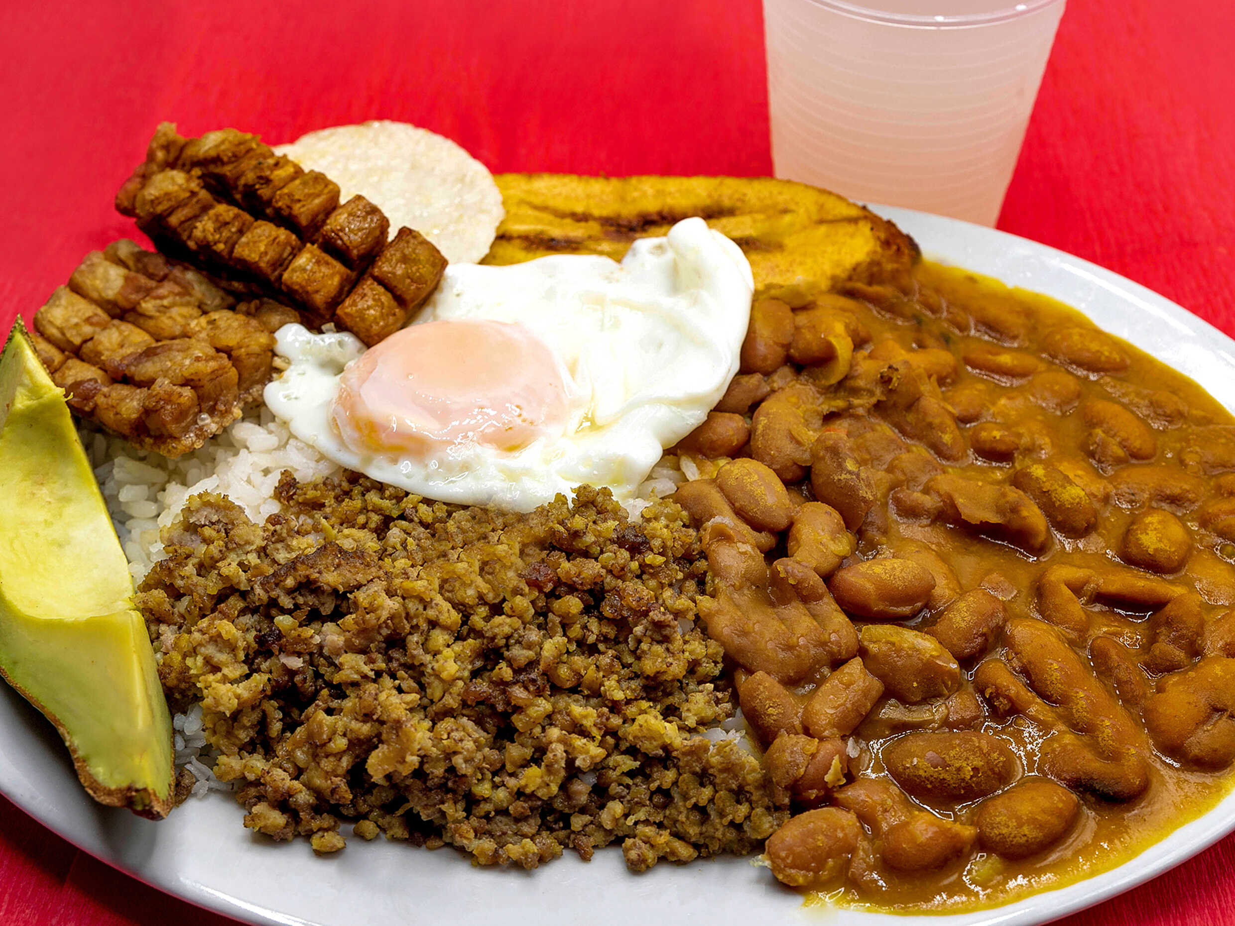 Acompañado de arroz, aguacate, chicharrón, carne molida, arepa, tajada, chorizo, huevo y limonada.