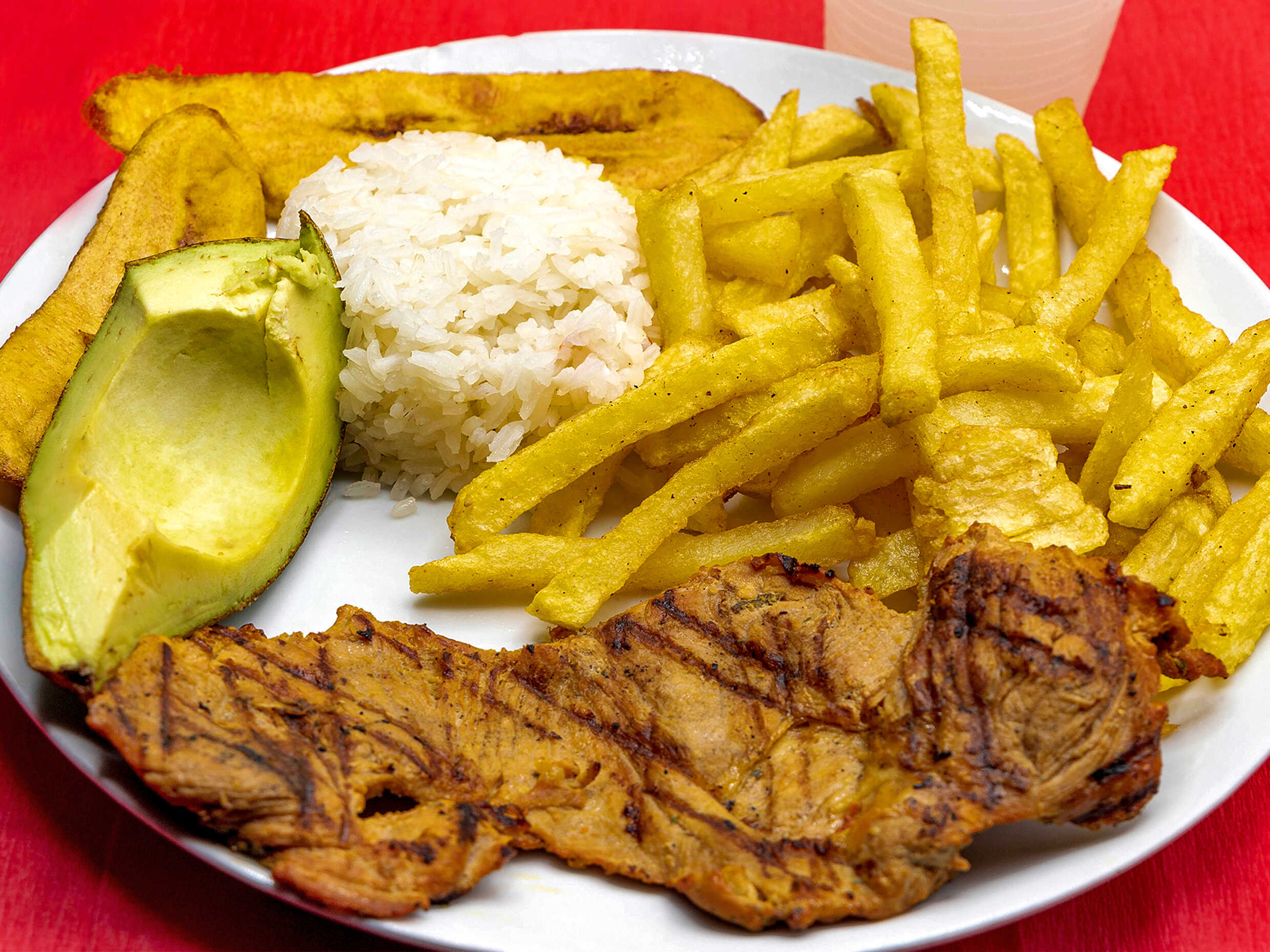 Carne, pollo y cerdo, acompañada de arroz, francesa, aguacate, tajadas y limonada.