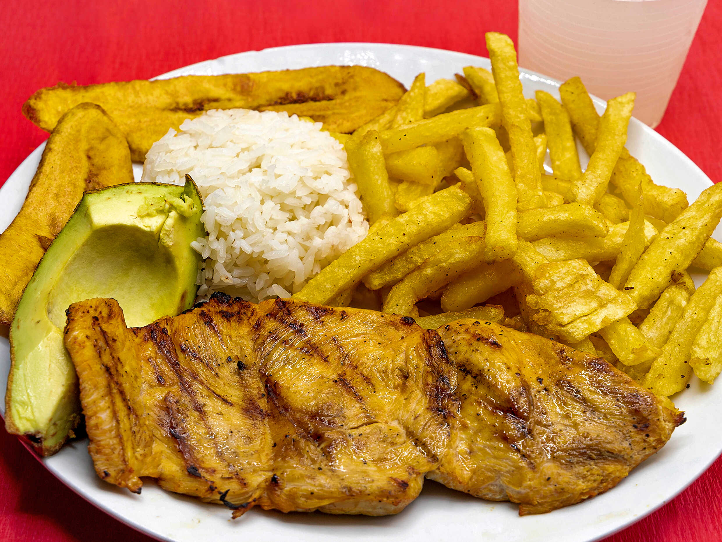 Pechuga de pollo, acompañada de arroz, francesa, aguacate, tajadas y limon