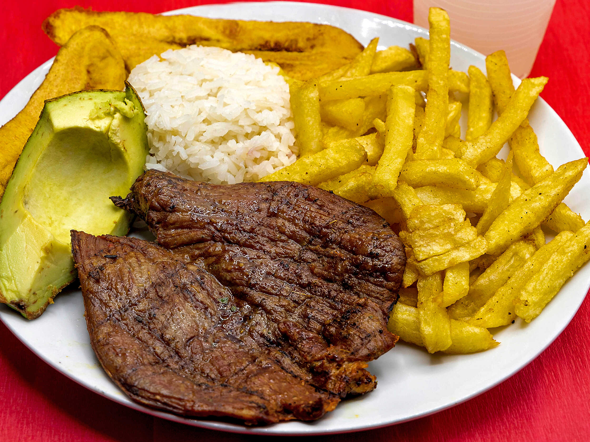 Carne de chata de res, acompañada de arroz, francesa, aguacate, tajadas y limonada.