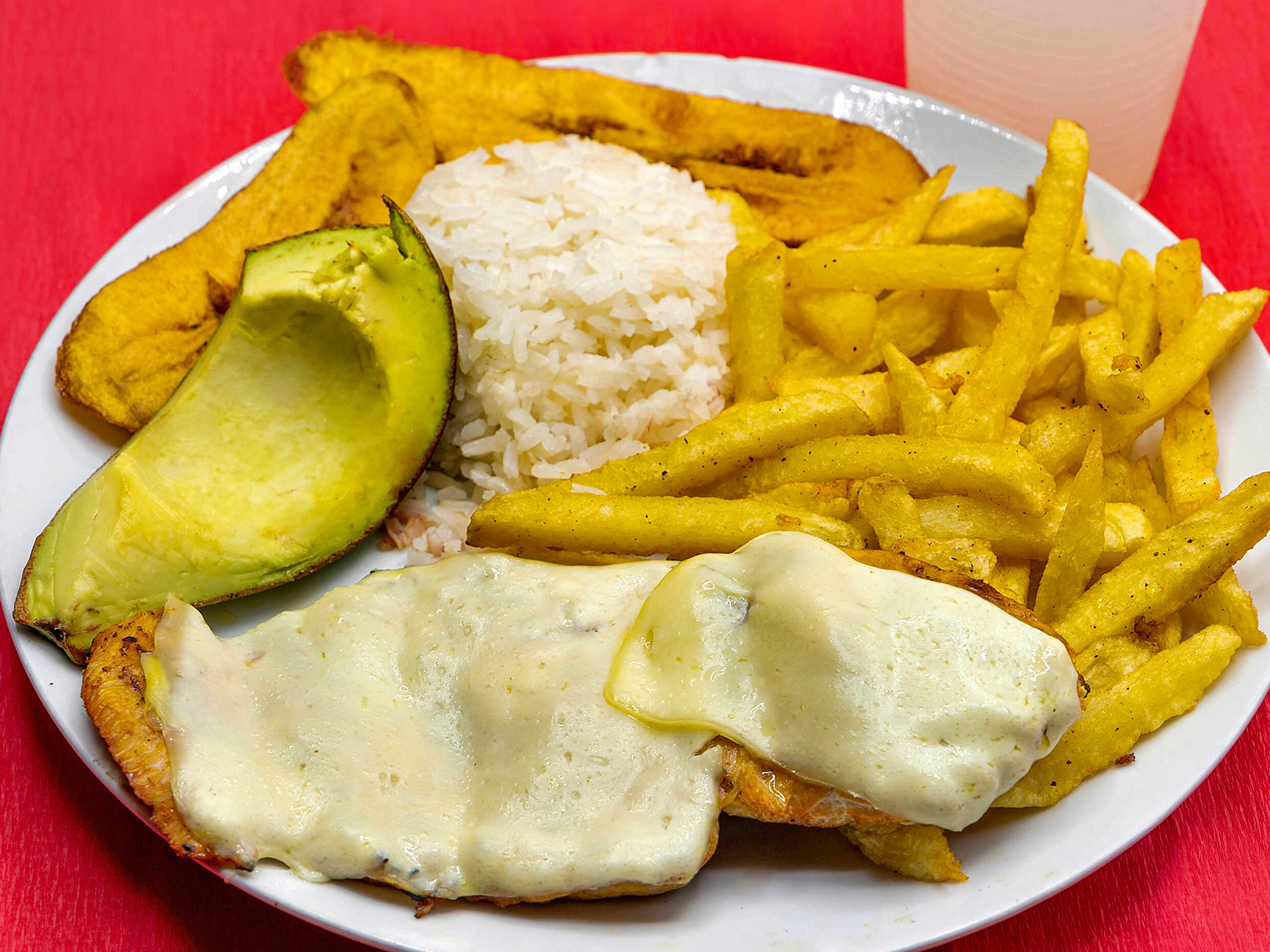 Pechuga de pollo gratinada, acompañada de arroz, francesa, aguacate, tajadas y limonada.