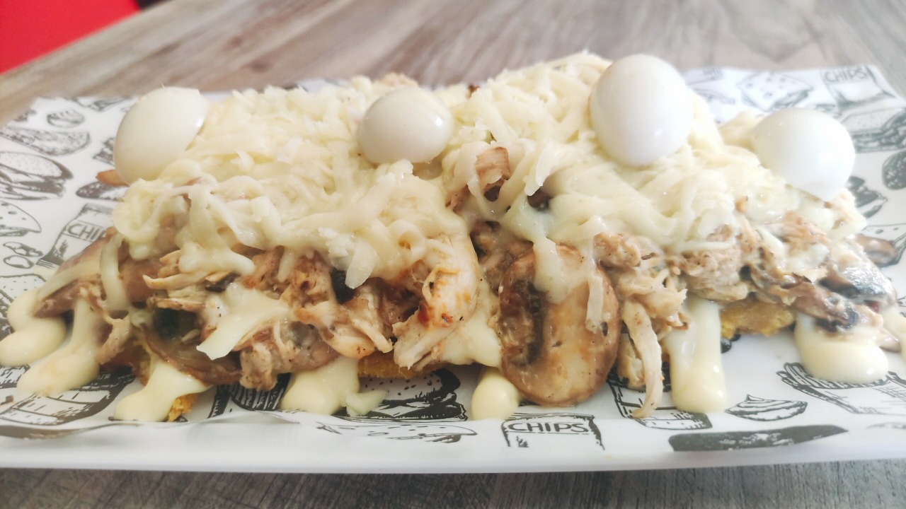 Patacon relleno con pollo desmechado, champiñon, en mantequilla, queso, huevo de codorniz, salsa de la casa