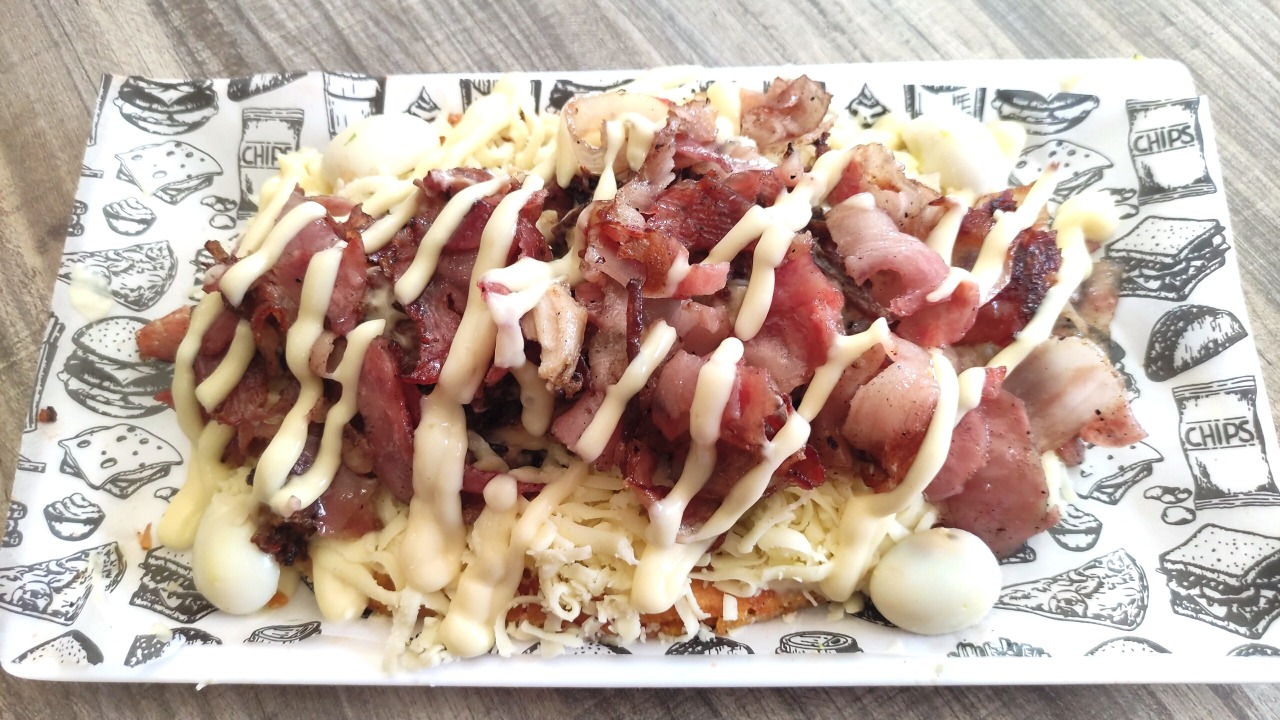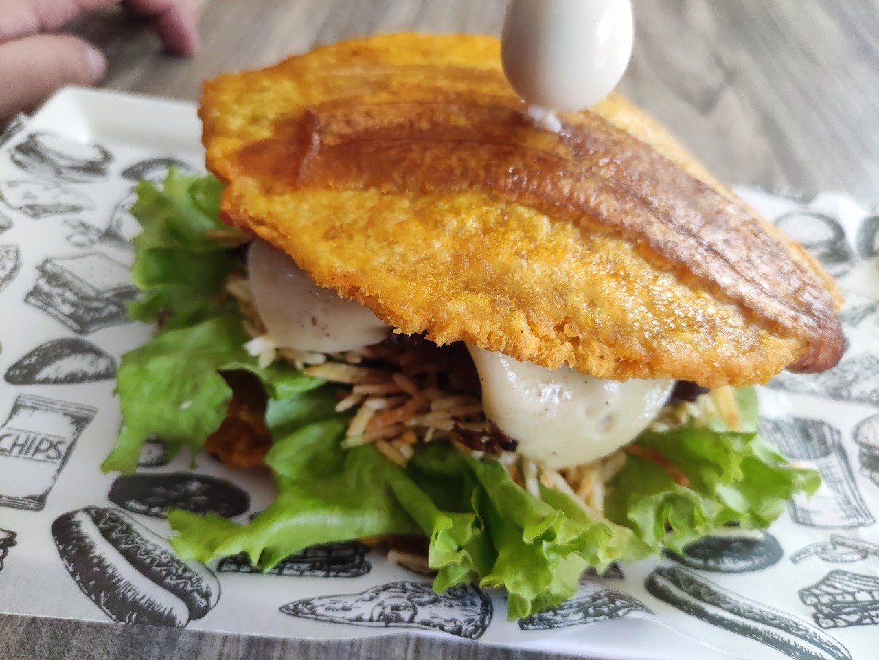 Patacon relleno con chorizo, carne desmechada, tocineta, queso, salsa de la casa, huevo de codorniz