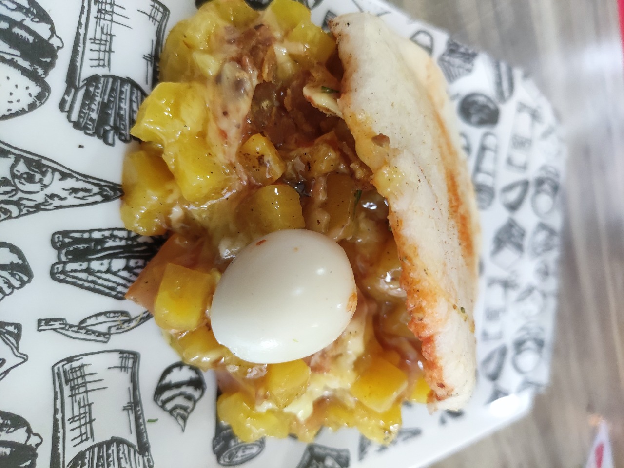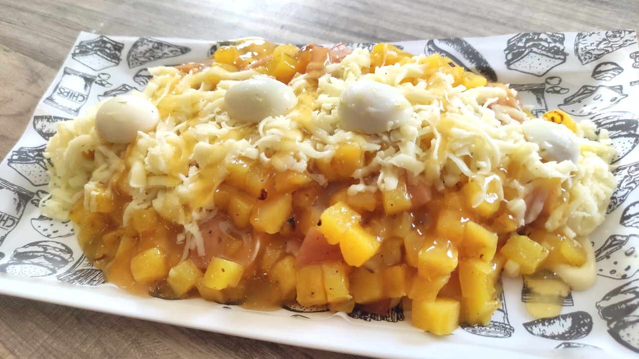 Patacon rello de piña en trozos, salsa de la casa, jamon, queso gratinado, huevo de codorniz