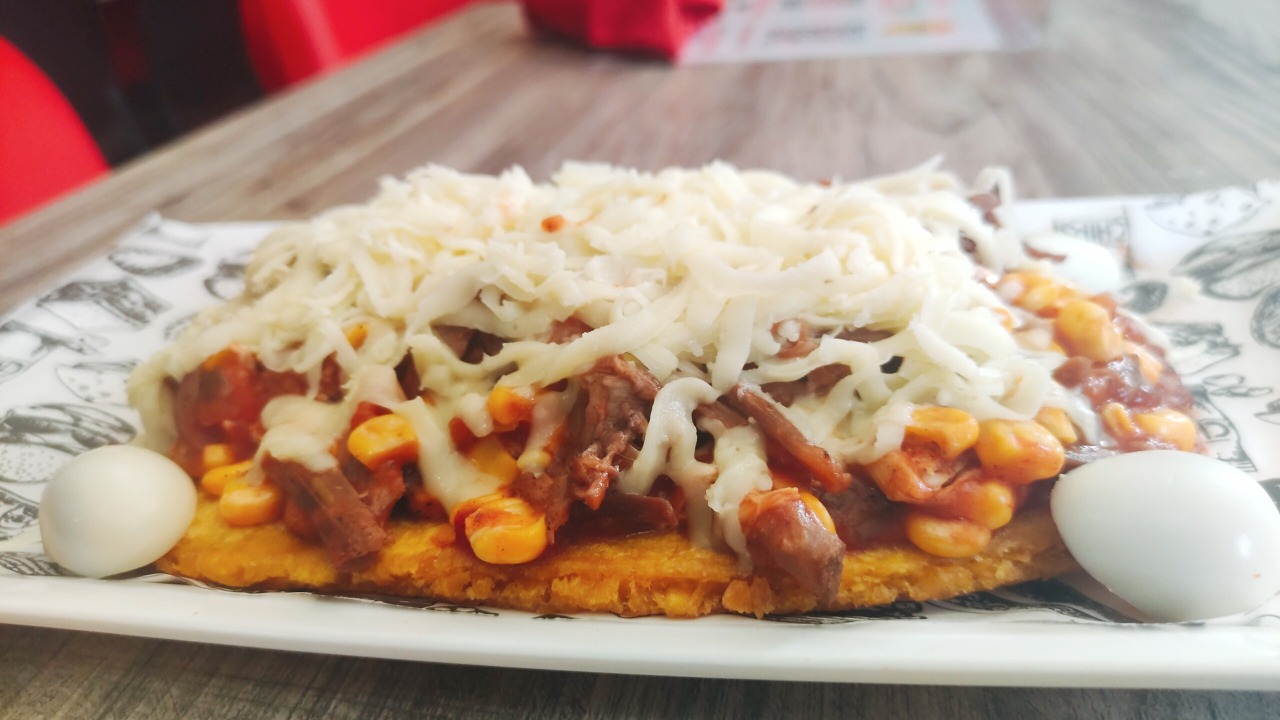 Patacon relleno, de carne molida, hogao de la casa, queso, huevos de codorniz, pico de gallo, maiz