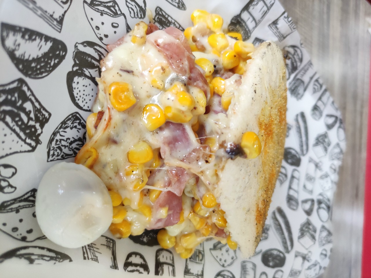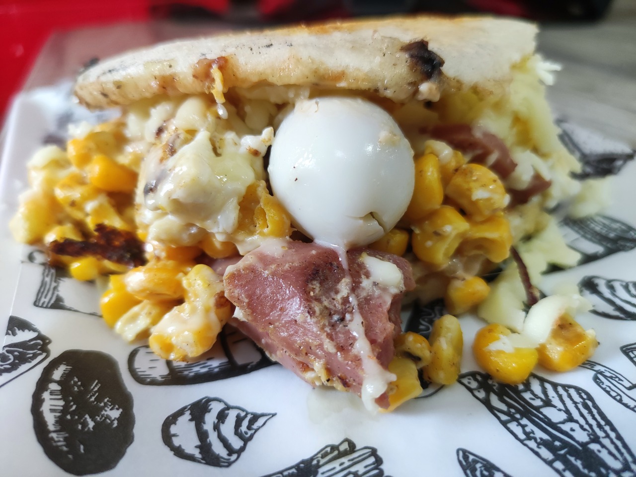 Arepa rellena de salchicha, huevo frito, maiz, queso y huevo de codorniz salsa de la casa