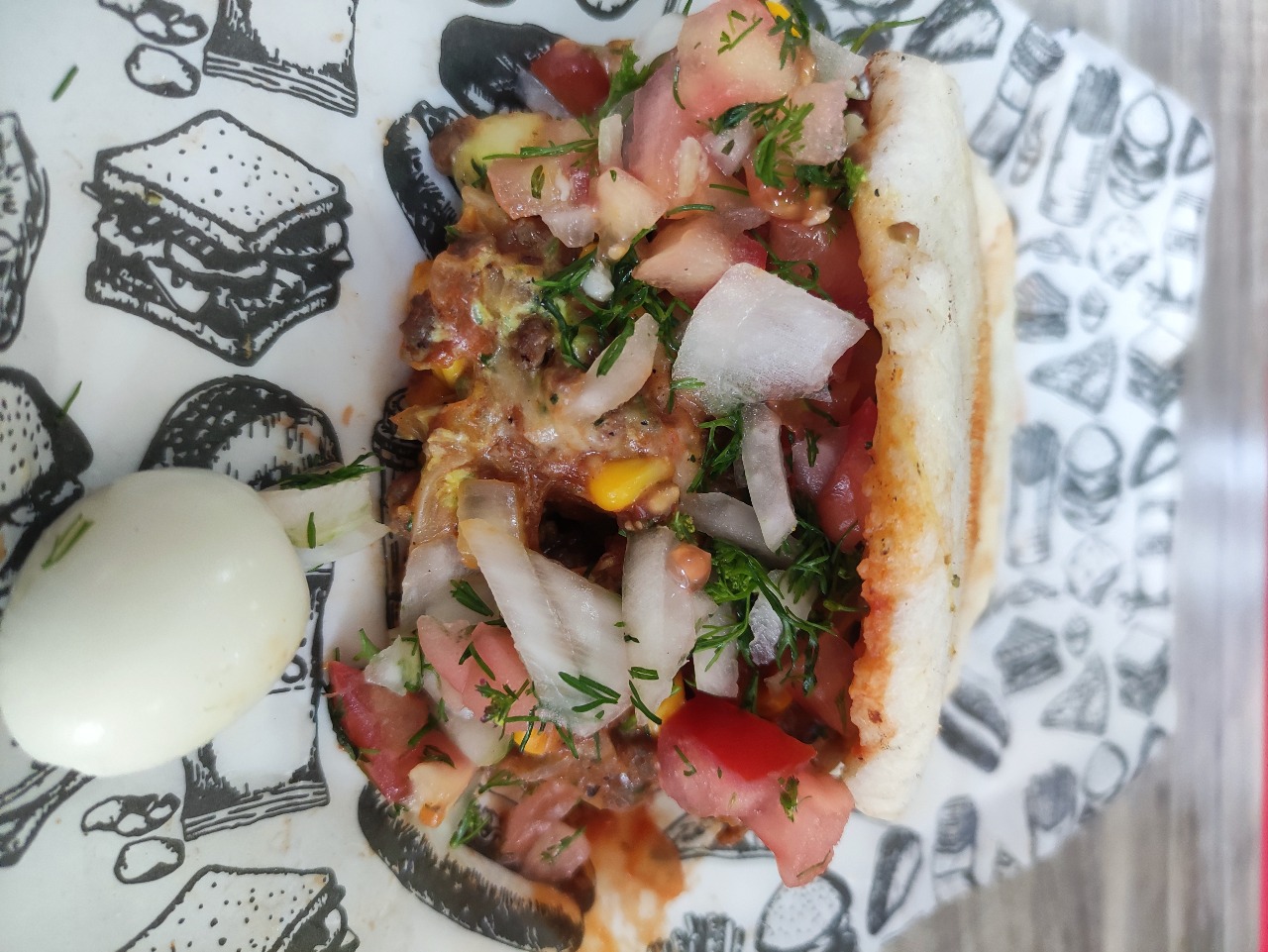 Arepa rellena de carne molida, pico de gallo, Maiz, Hogao, queso y huevo de codorniz