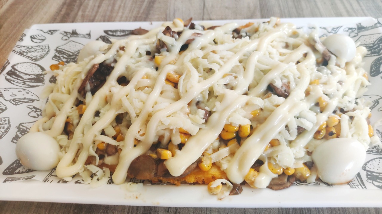 Patacon relleno de maiz, champiñon en mantequilla, queso, huevos de codorniz, salsa de la cas