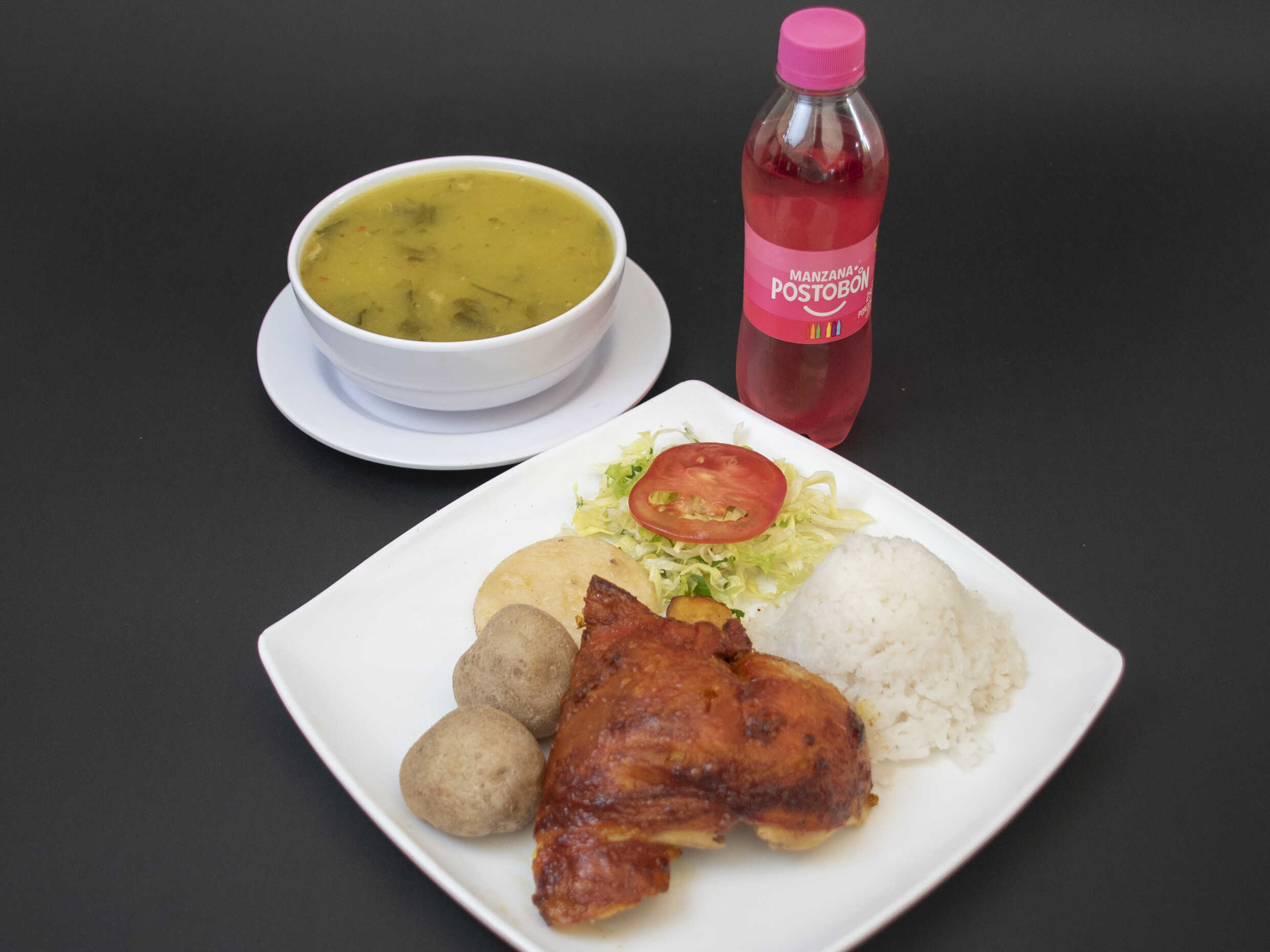 Acompañado de sopa del día, 1/4 de pollo asado, arroz, papa salada, arepa y bebida 250 ml.