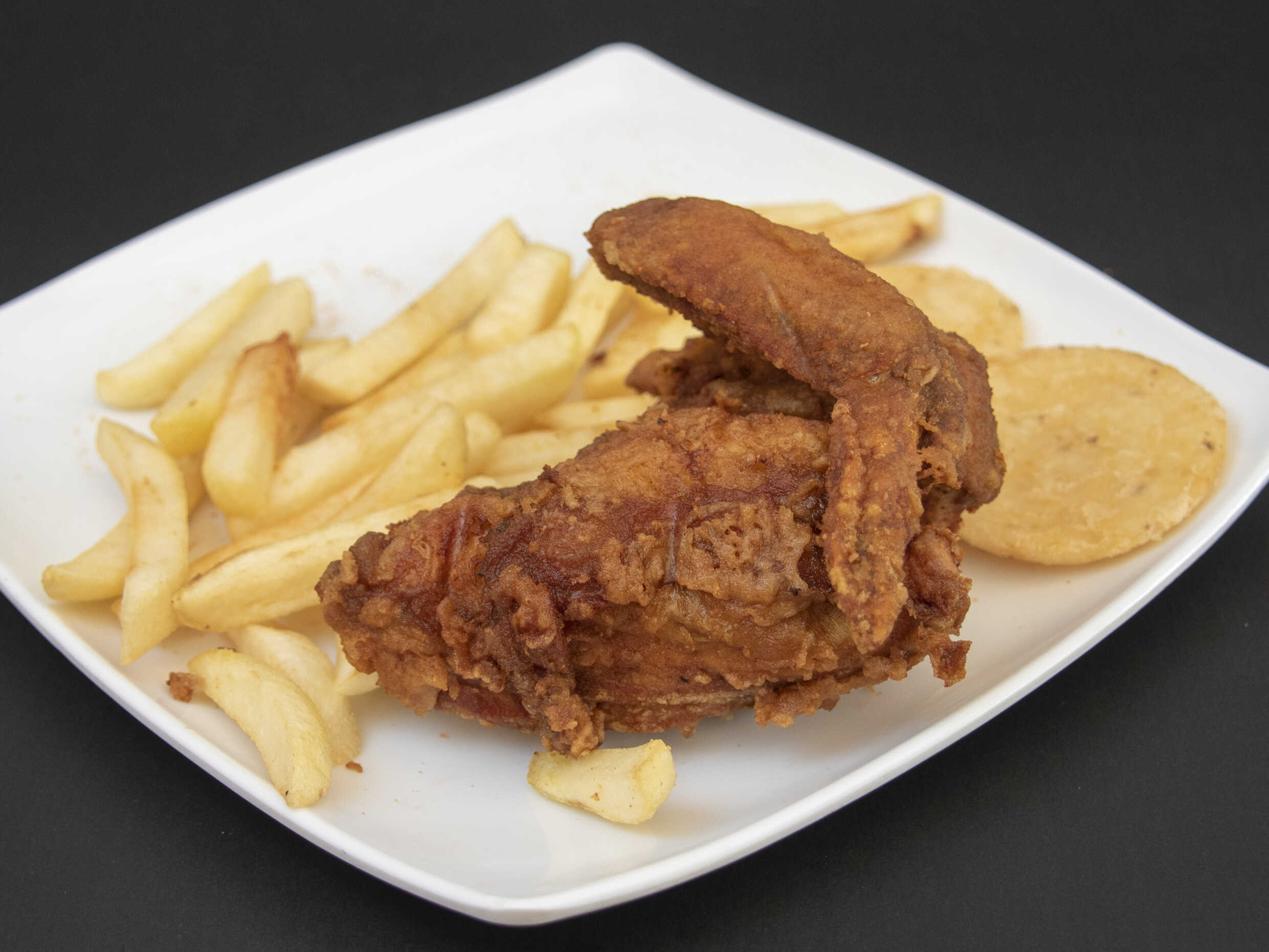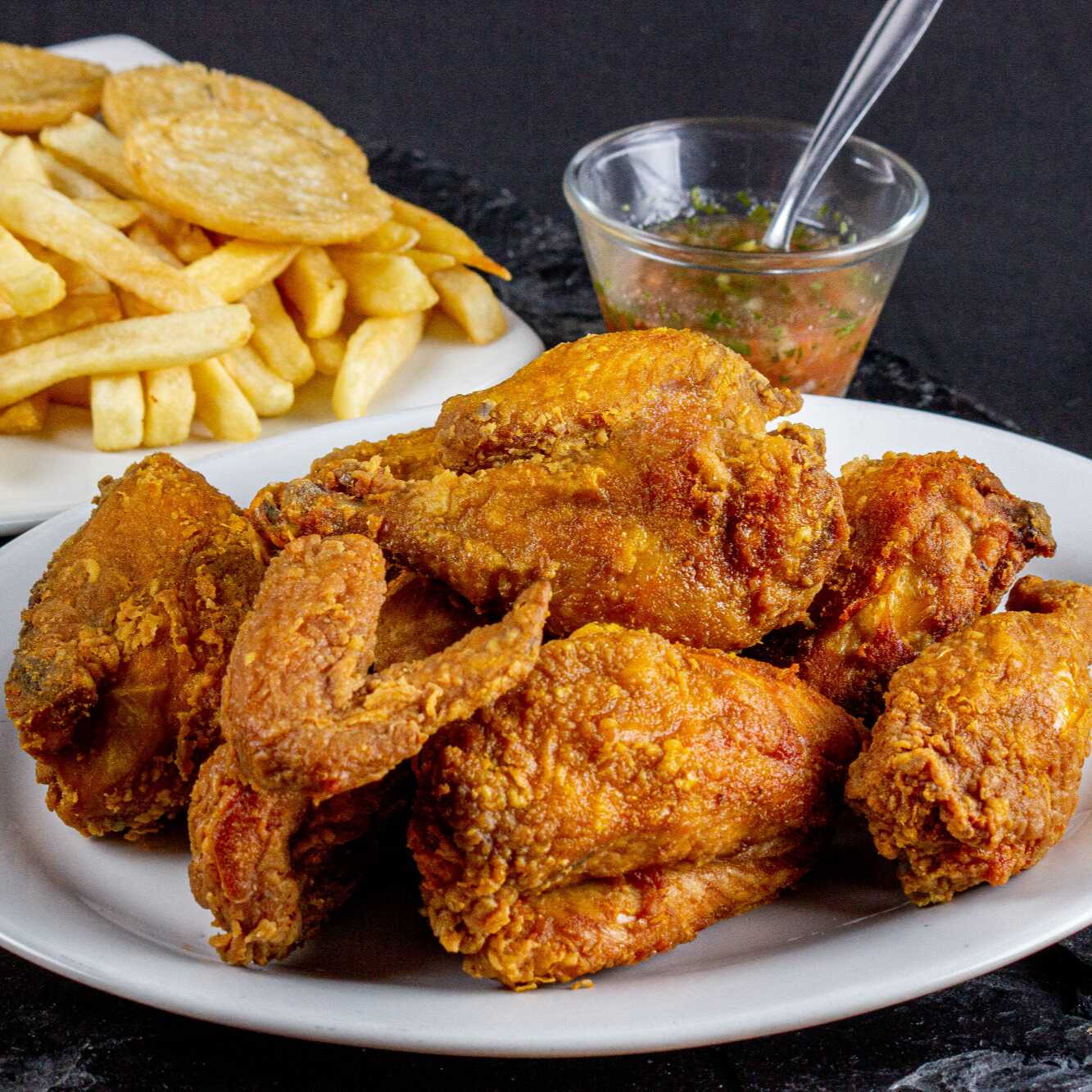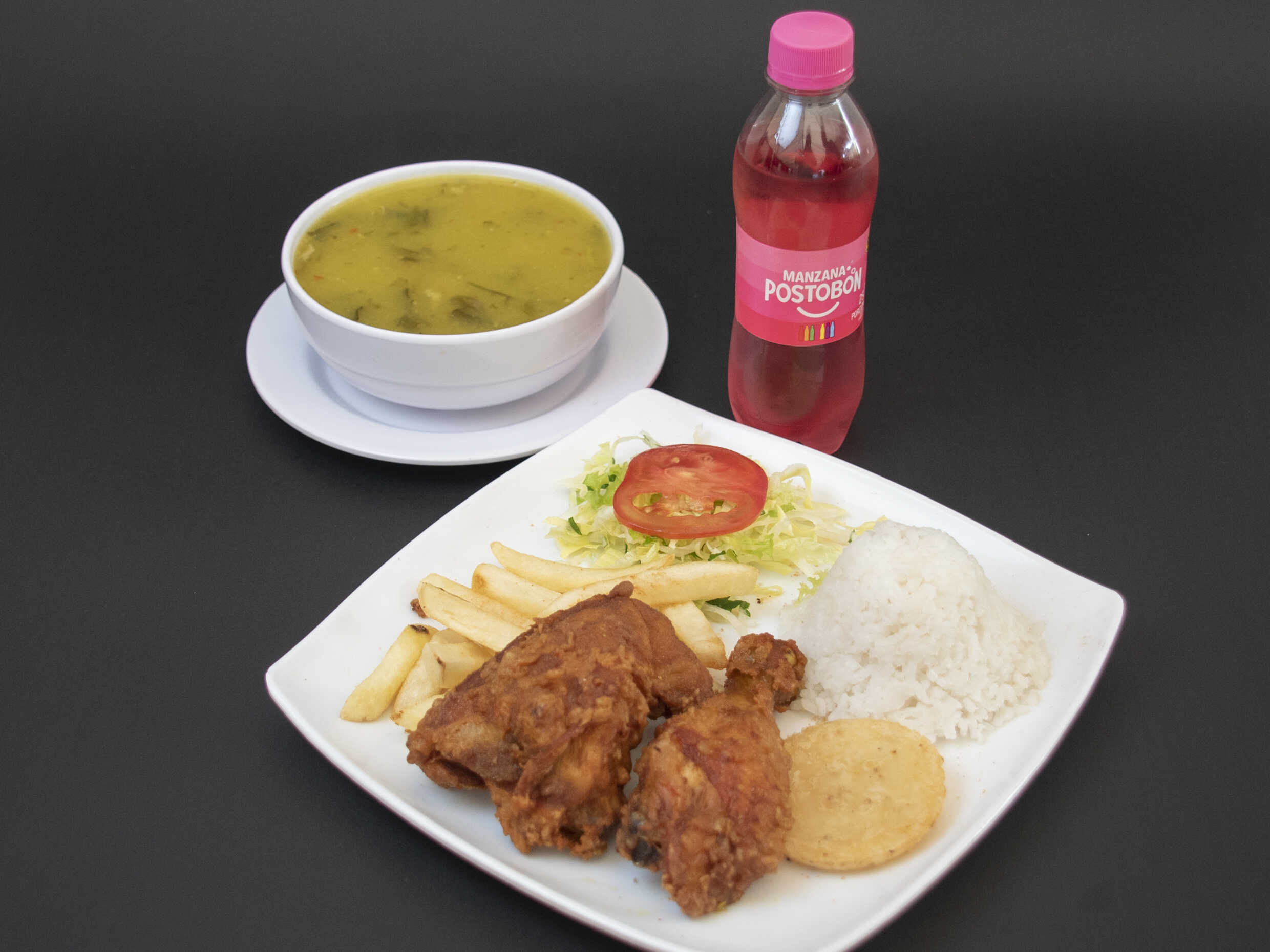 Acompañado de sopa del día, 1/4 de pollo broaster, arroz, papa francesa, arepa frita y bebida 250 ml.