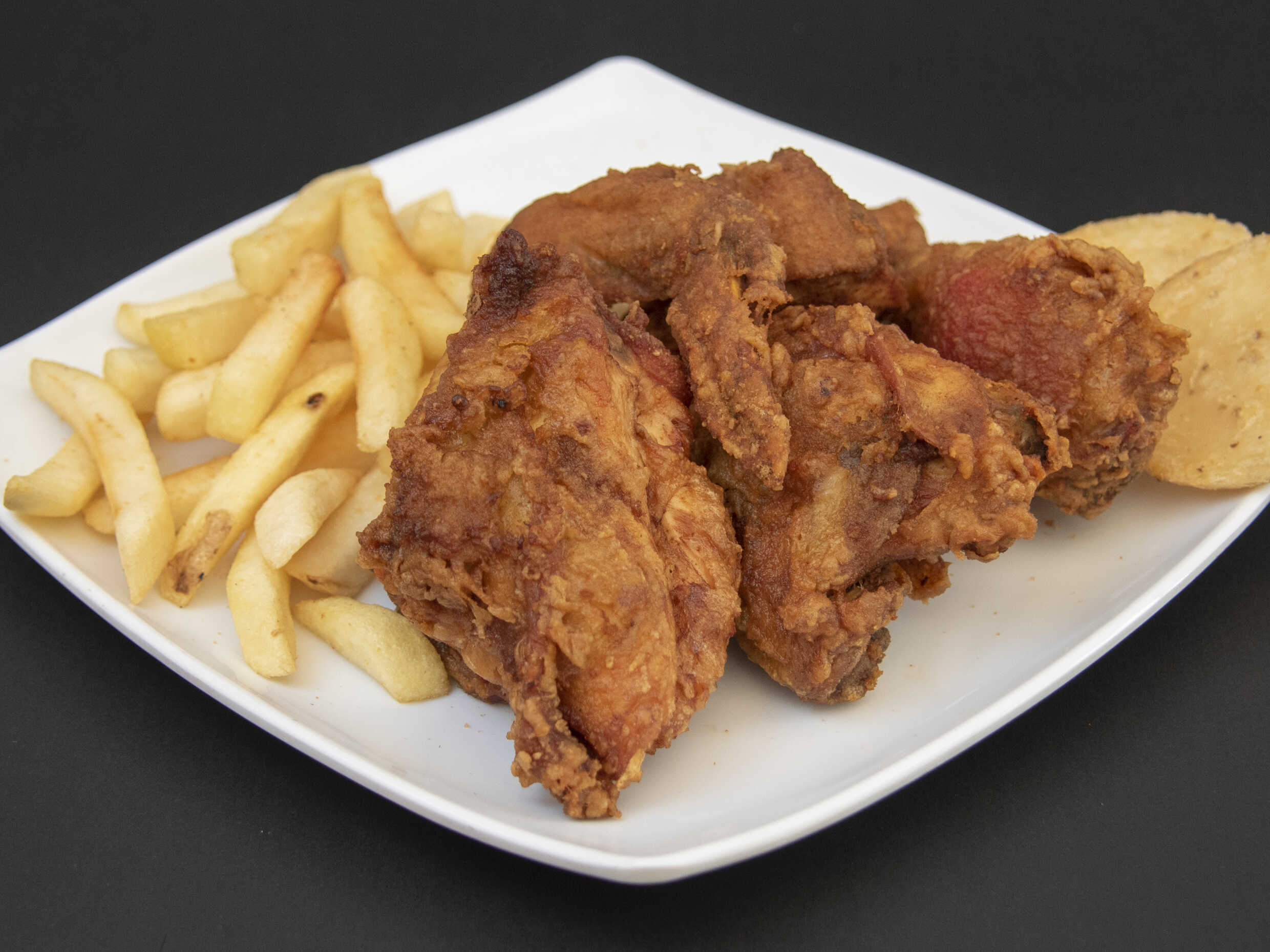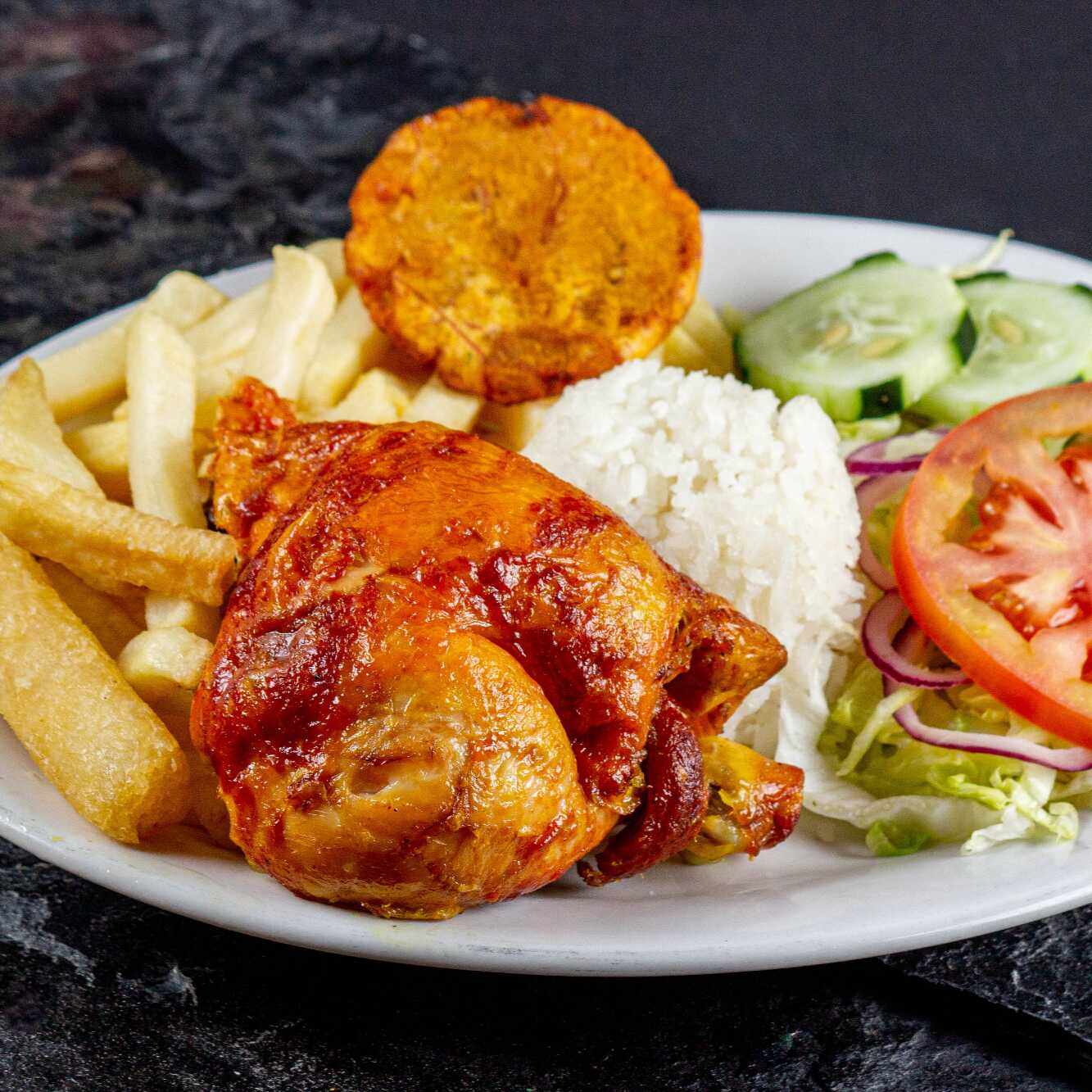 1/4 de pollo broaster + arroz + papa francesa + yuca + plátano + ensalada de la casa.