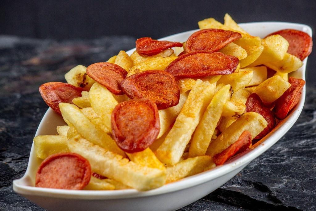 Papa francesa + arepa frita + salsa de tomate + miel + ají.