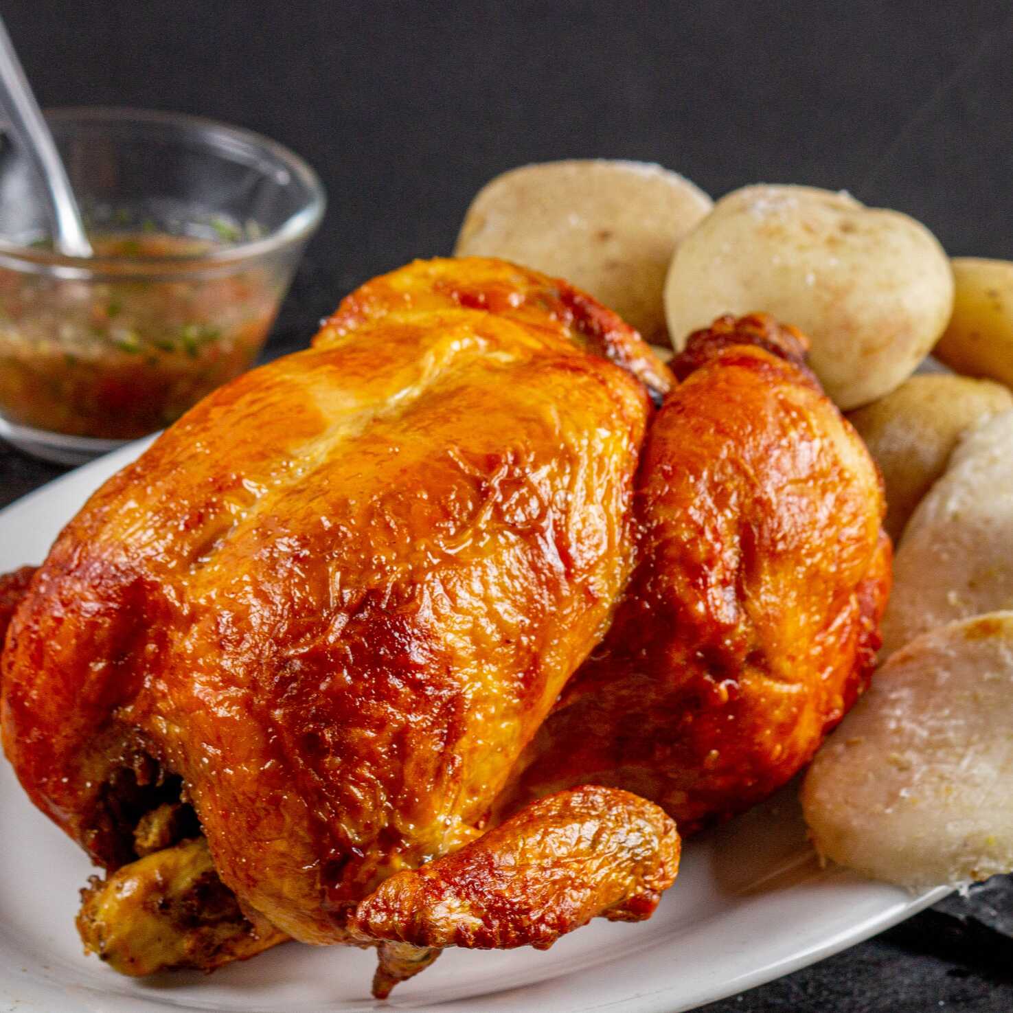 1/4 de pollo asado + arroz + papa francesa + yuca + plátano + ensalada de la casa.