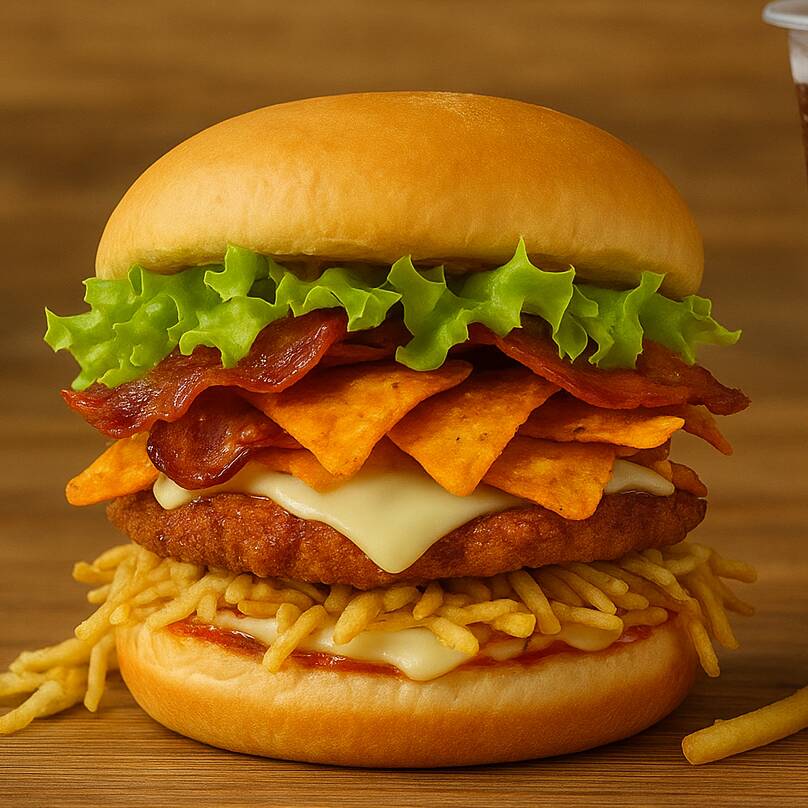 Hamburguesa con Carne de res, papa cabello de Ángel, lechuga, tomate, queso, tocineta y topping de nachos sabor a queso