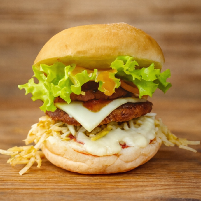 Hamburguesa con carne de res, vegetales frescos, queso, papa cabello de Angel y salsas. **IMÁGENES DE REFERENCIA** ***TAMAÑO DE PORCIÓN. 1 PERSONA***