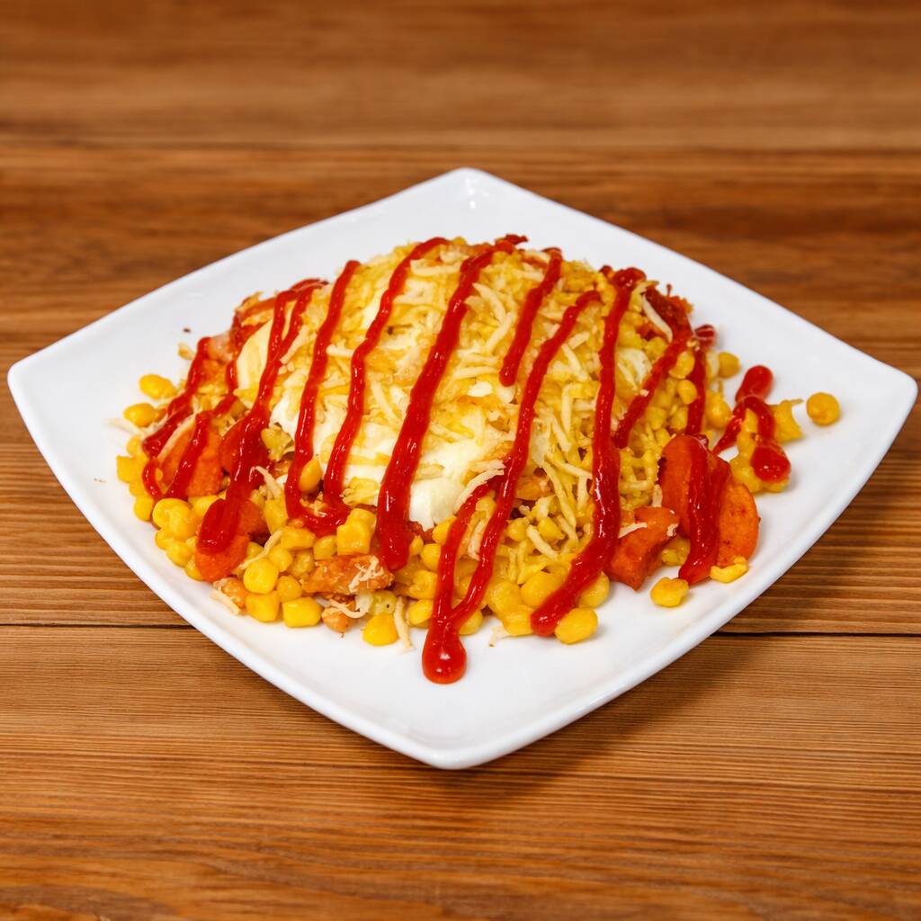 150 g De maíz tierno, salchicha, pollo desmechado, queso, papa chip, salsa BBQ. ***TAMAÑO DE PORCIÓN. 1 PERSONA. Peso Aproximado. 325gr***