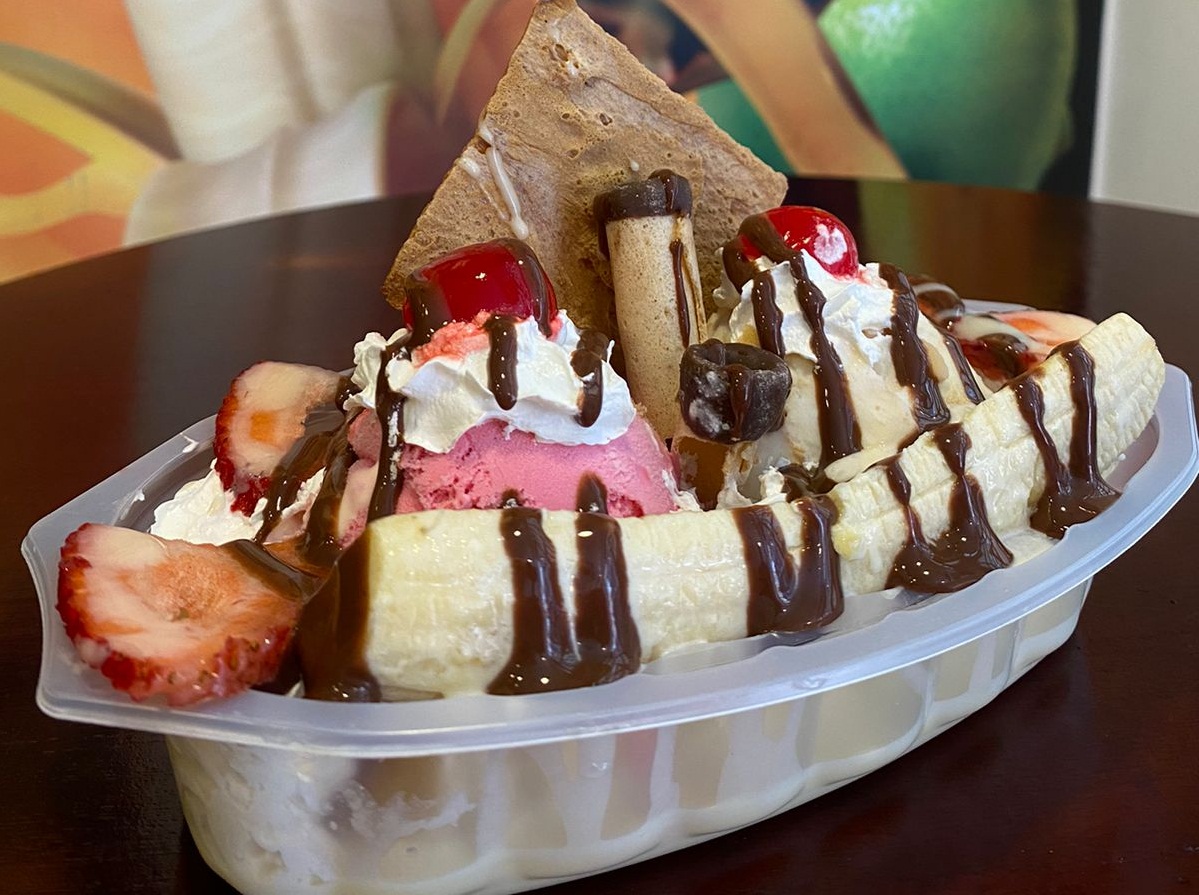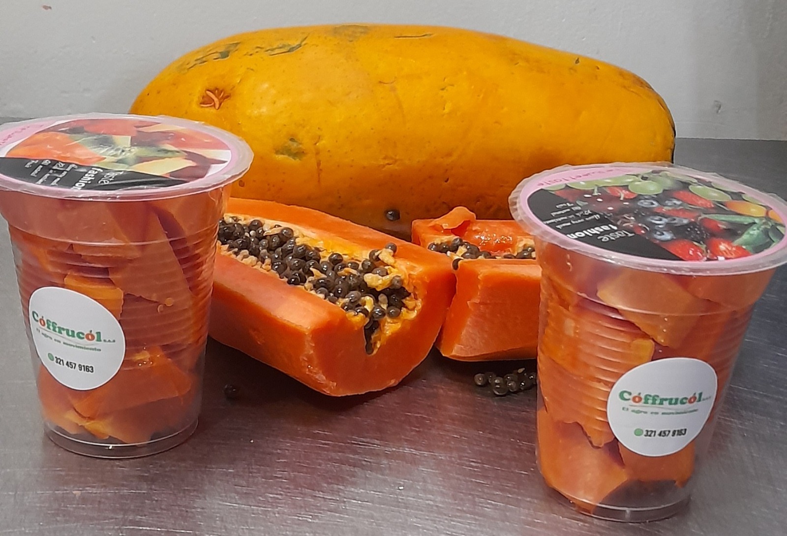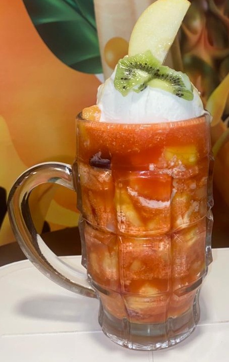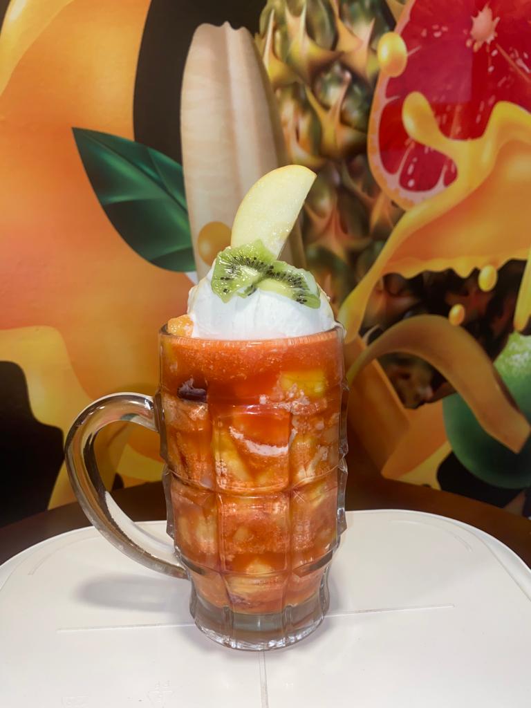 Mezcla de papaya, mango, piña, banano, manzana y helado.