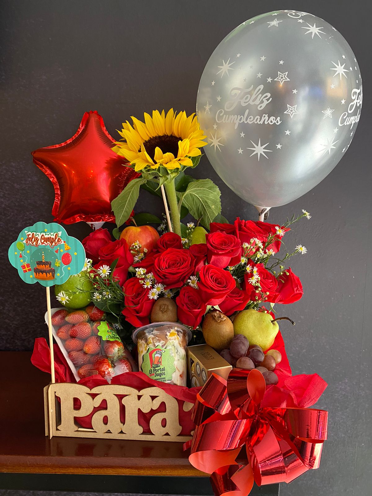 Arreglo floral ,globo, bomba, fruta en fresco ( manzana, fresa, kiwi) 1 girasol, parfait, caja de ferrero, cinta.