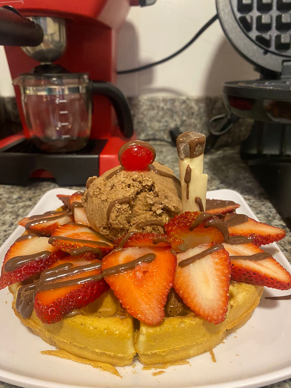 Nutella o arequipe, fresa, banano, cereza y 1 porción de helado.