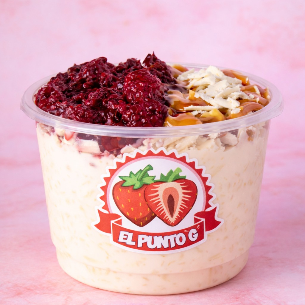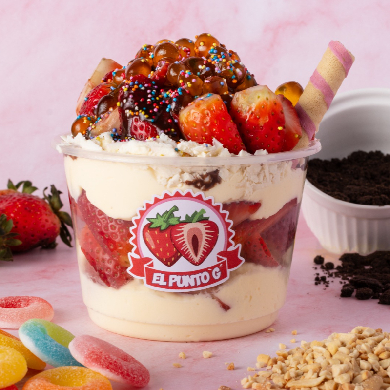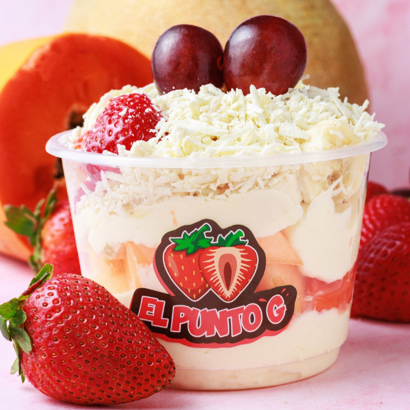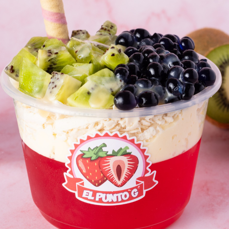 Gelatina con crema artesanal, fruta y topping.