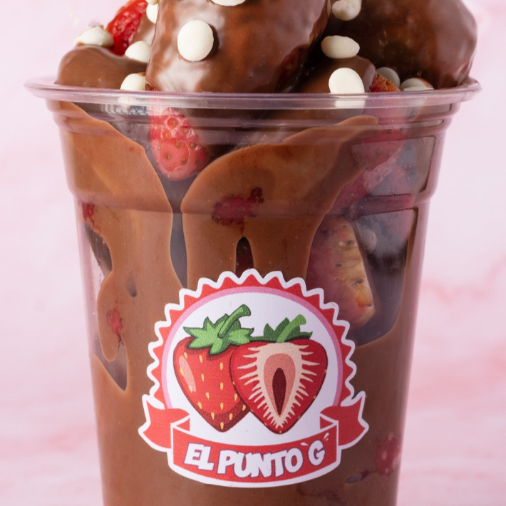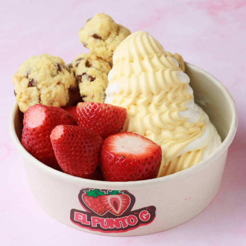 Combinación de galletas mini tipo new york de chocolate, con helado de yogurt, sabor disponible y fresas frescas.