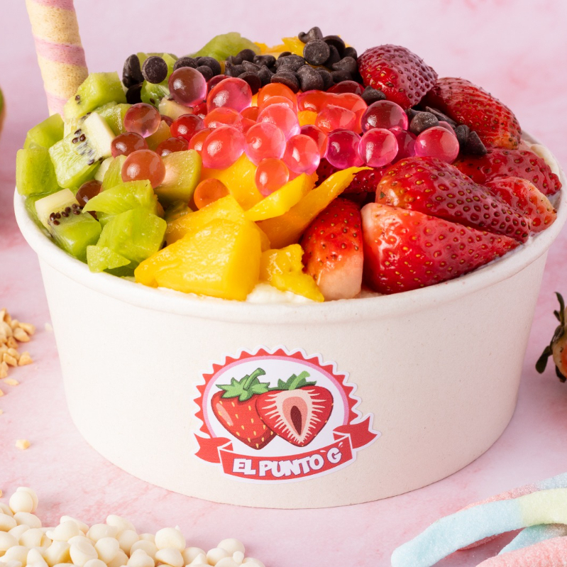 Bowl de frutas con chocolate y crema artesanal.