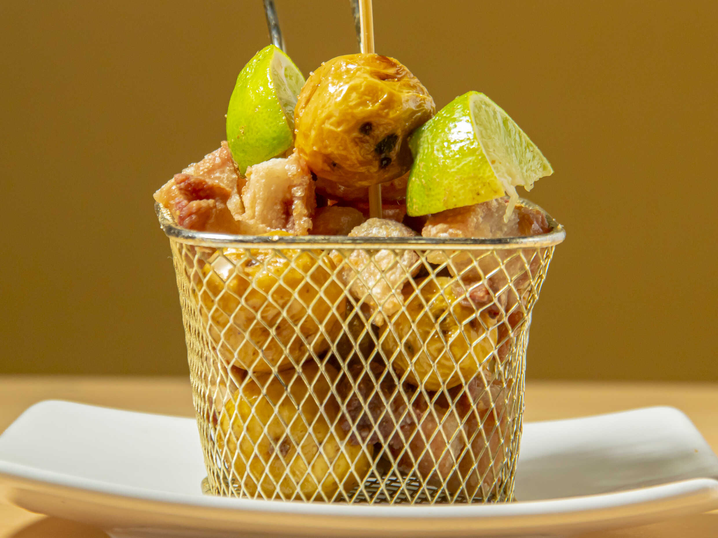 Salchicha Americana, Chorizo, papa francesa, papa criolla, y huevo de codorniz.