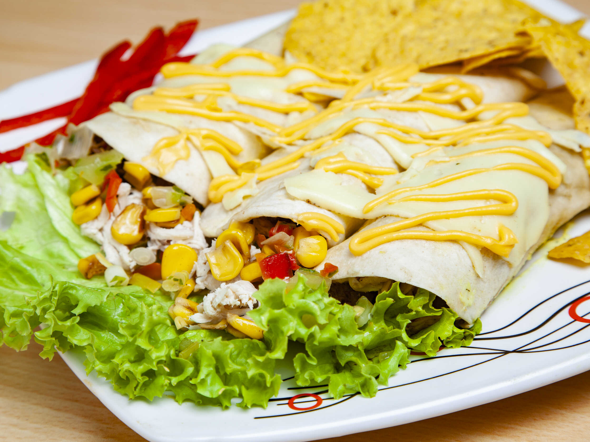 3 Deliciosos flautas con tortillas de maíz, carne, mazorca, queso, lechuga, pico e gallo y totopos.