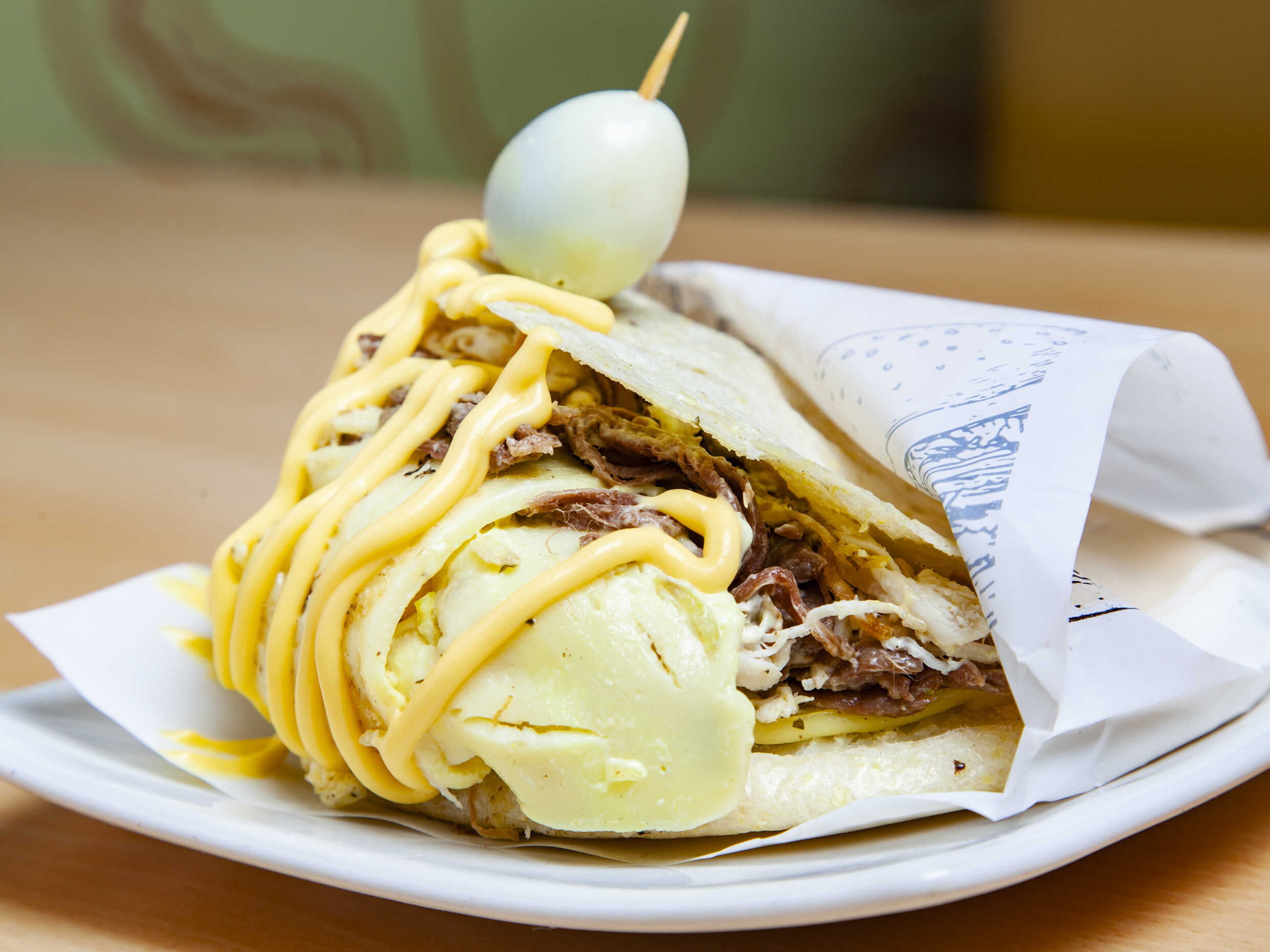 Arepa con carnes de res, queso y huevo de codorniz.