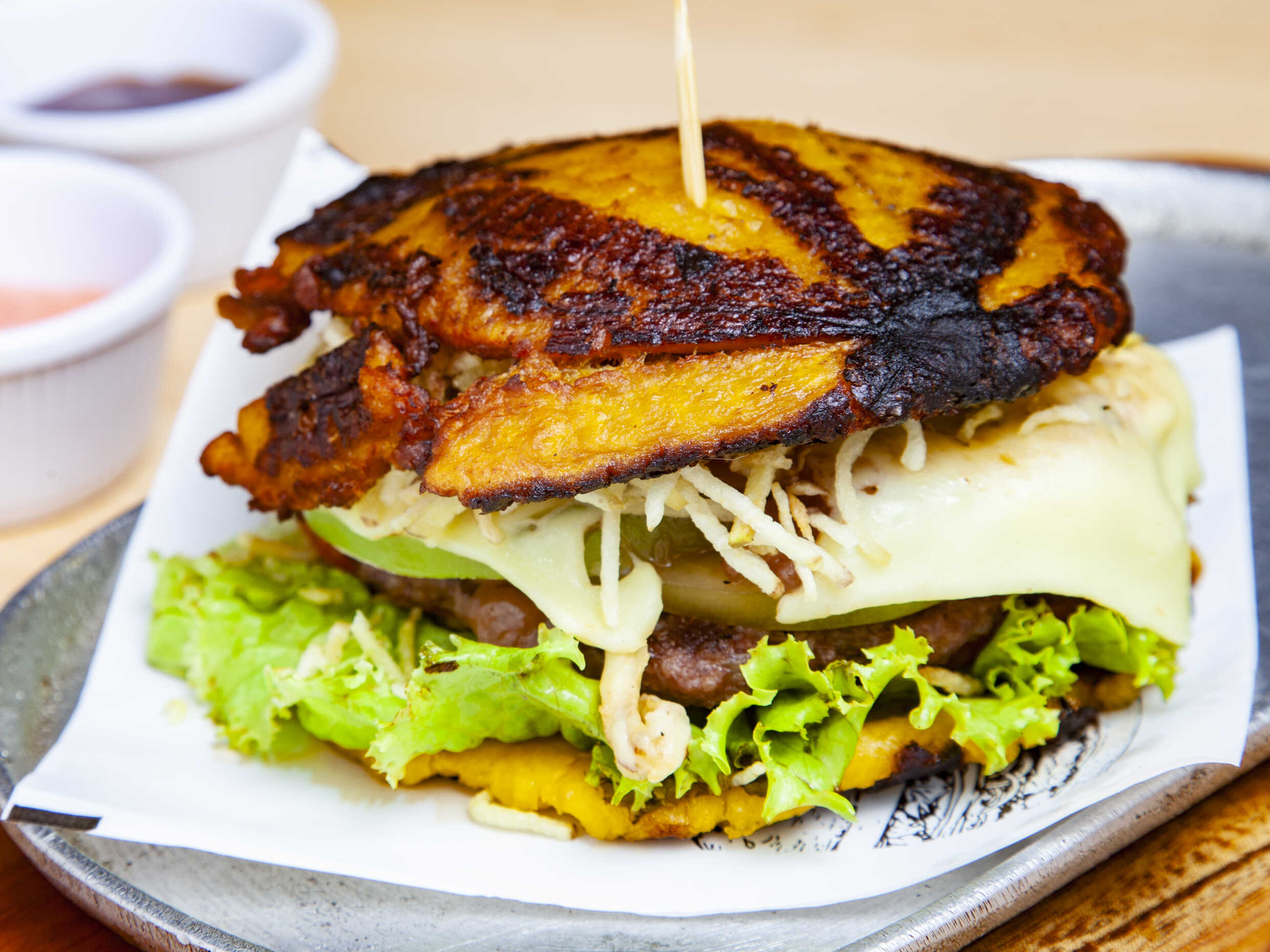 Un cuarto de carne 100% de res, plátano, cebolla caramelizada, lechuga, tomate, queso y papa chips.
