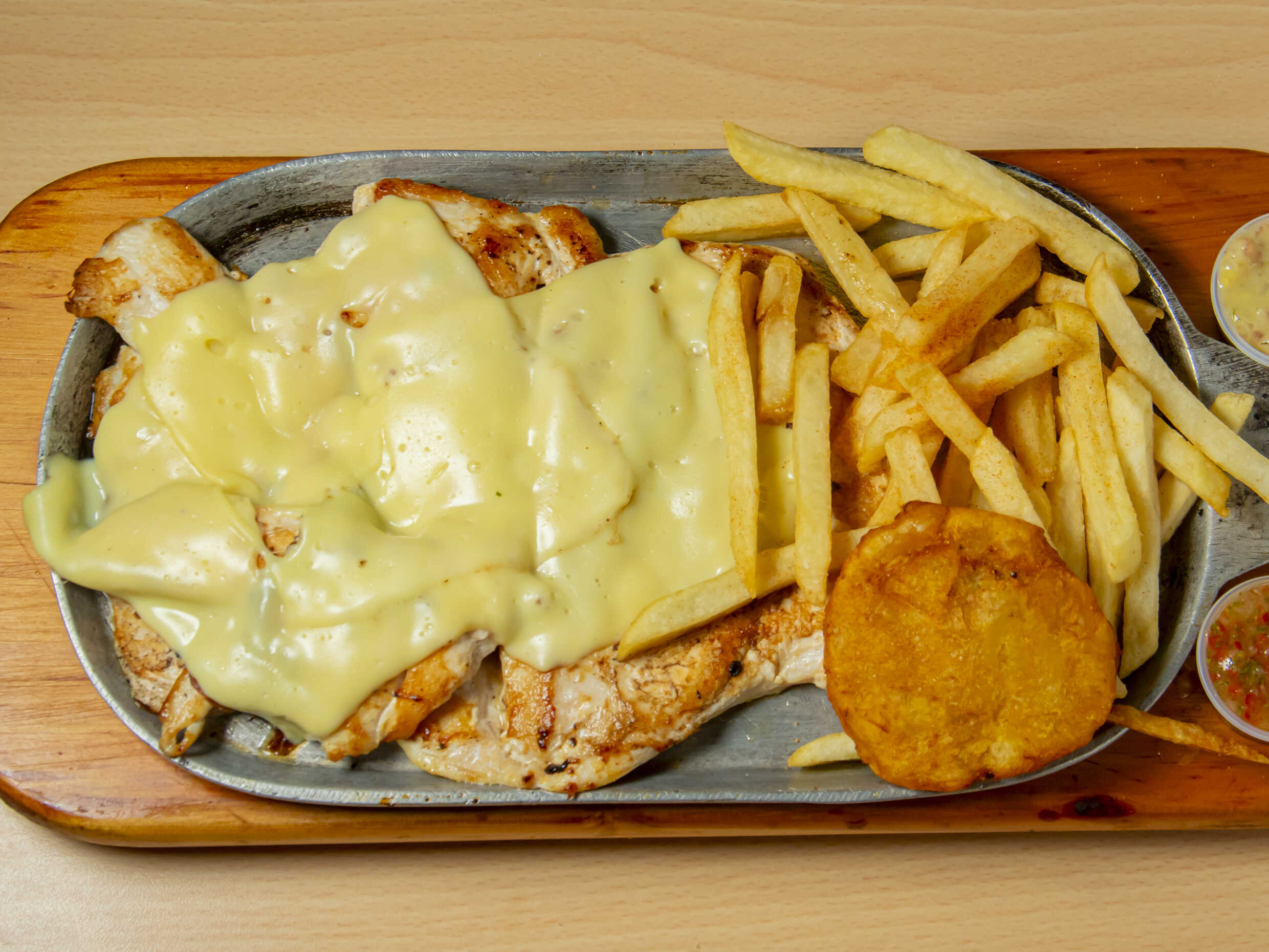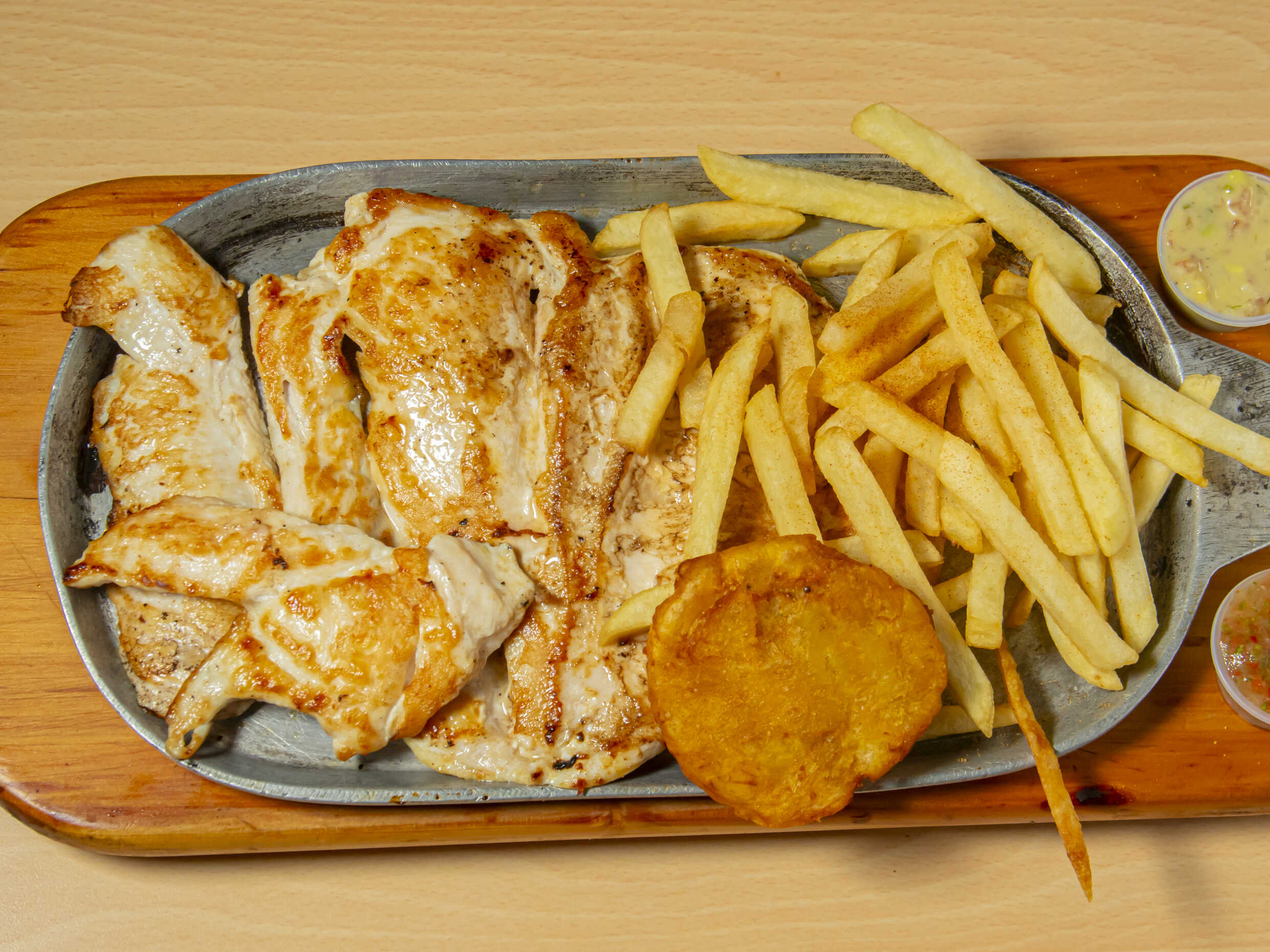 360 gramos de pechuga, papa salada, guacamole, chimichurri y patacon.