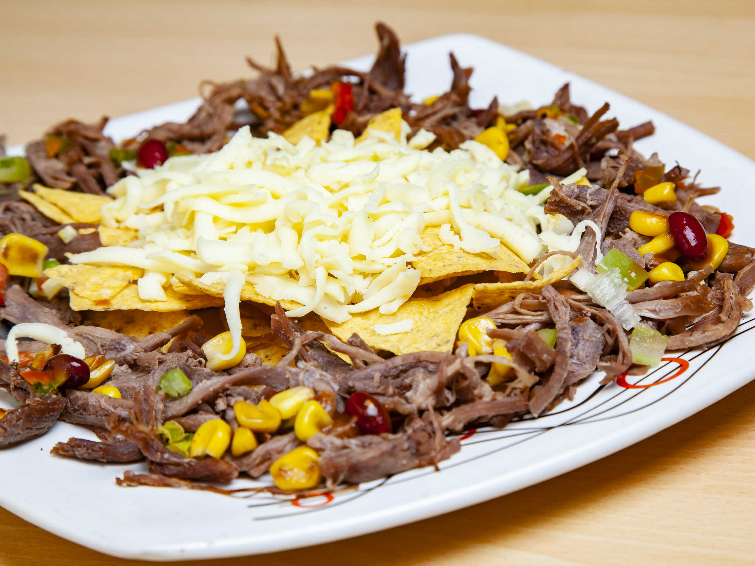 Deliciosos totopos con frijol, carne desmechada, mazorca, queso rallado, pico e gallo, guacamole y salsa de queso.