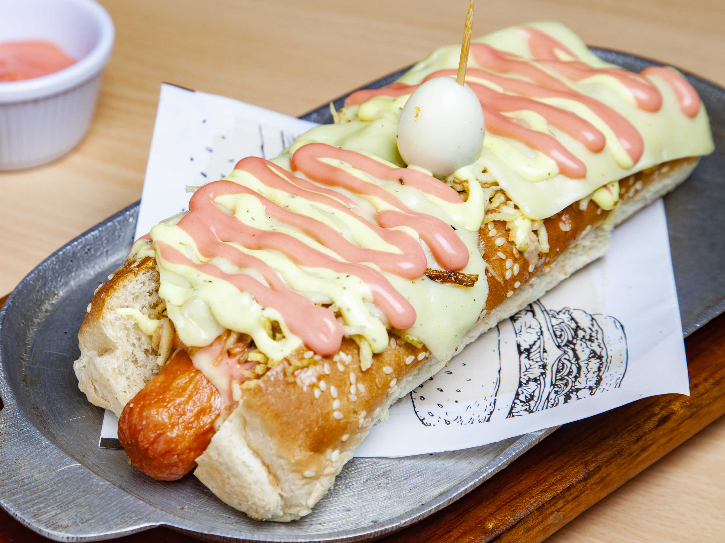 Perro con salchich americano, Cebolla, queso, papas chips, y huevo de codorniz