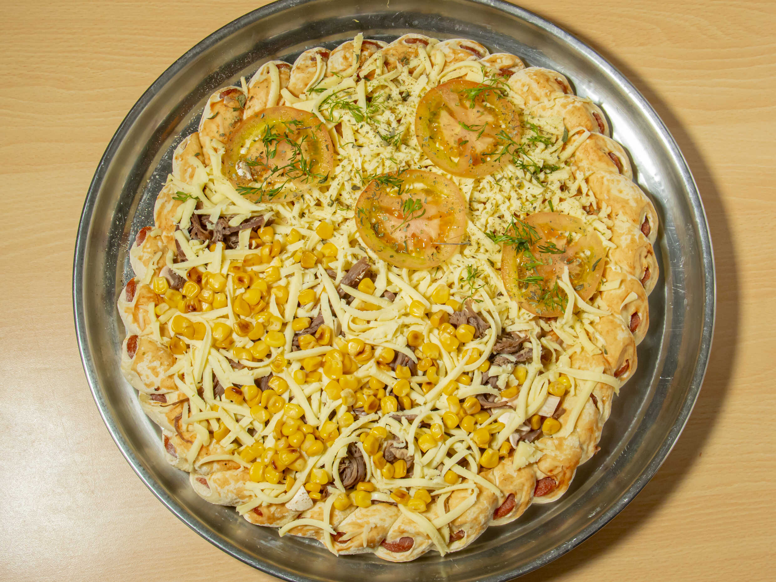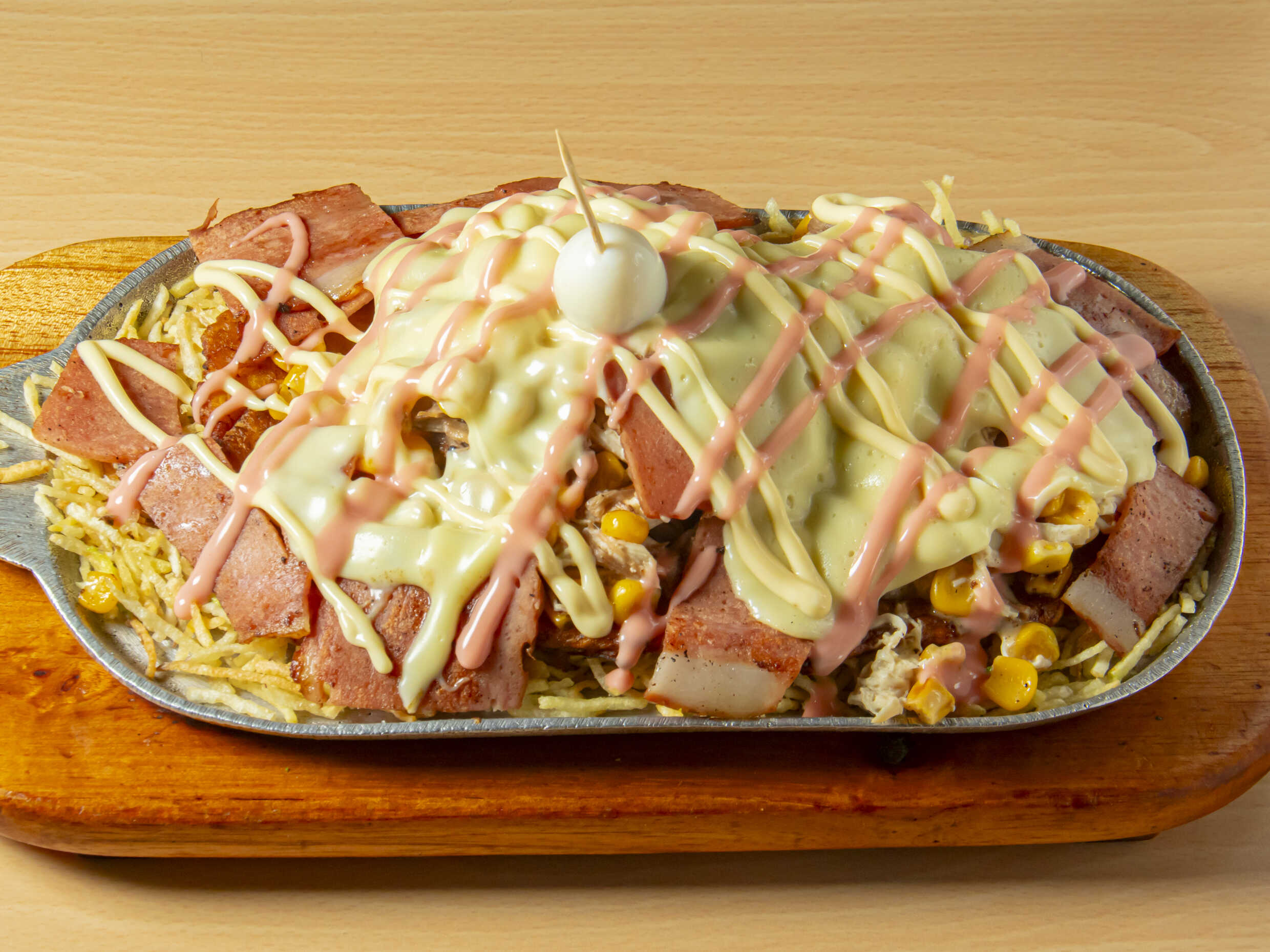 Pollo, mazorca, queso, jamón, tocineta, huevo de codorniz.
