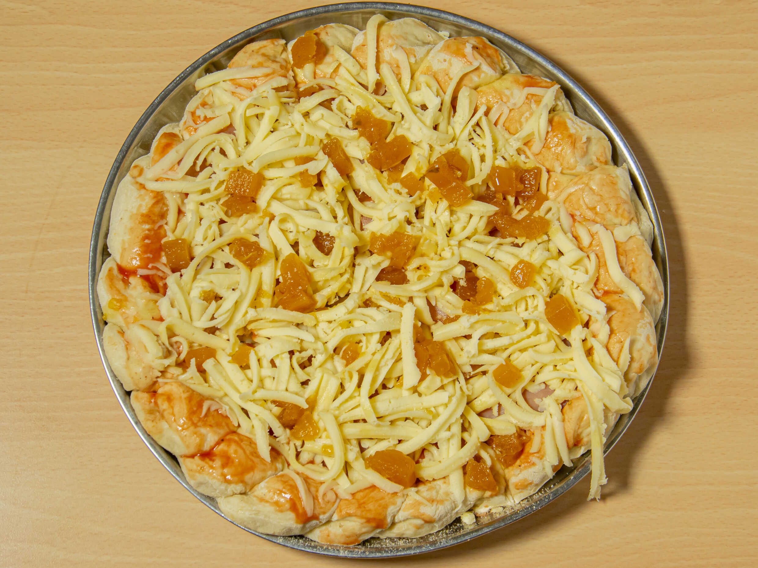 3 Deliciosos quesadillas con tortilla de trigo, piña, jamón, queso y salsa de queso.