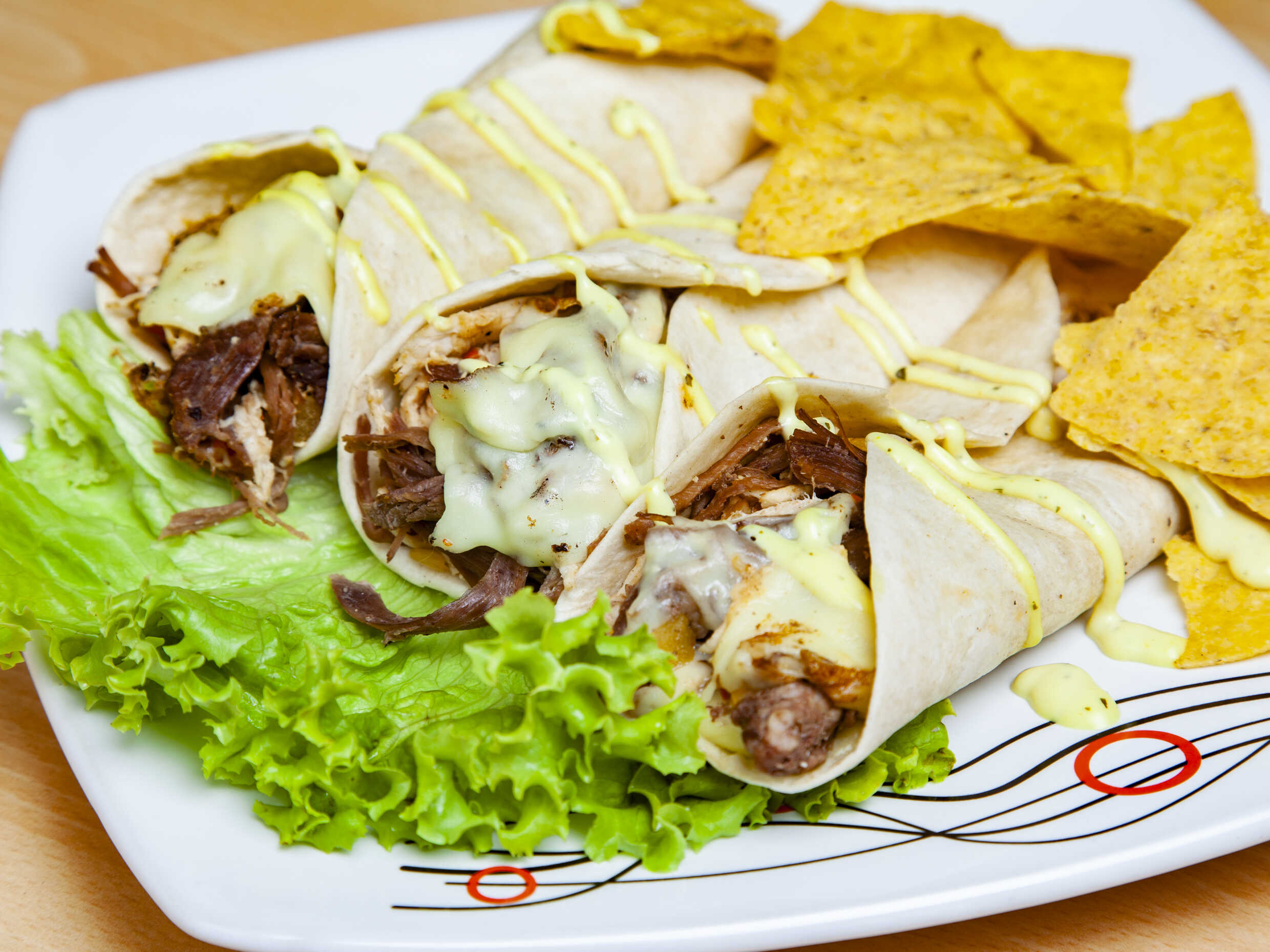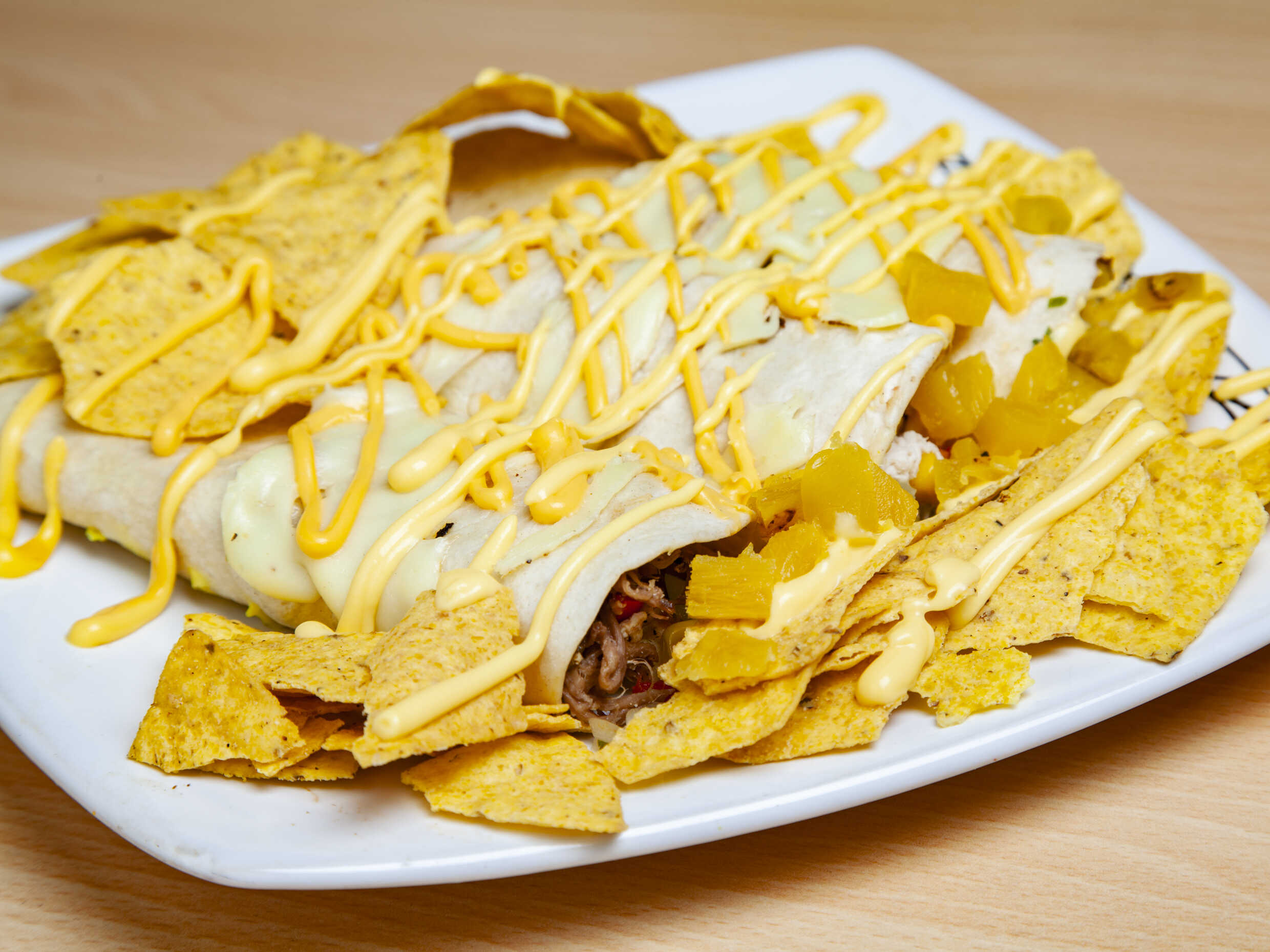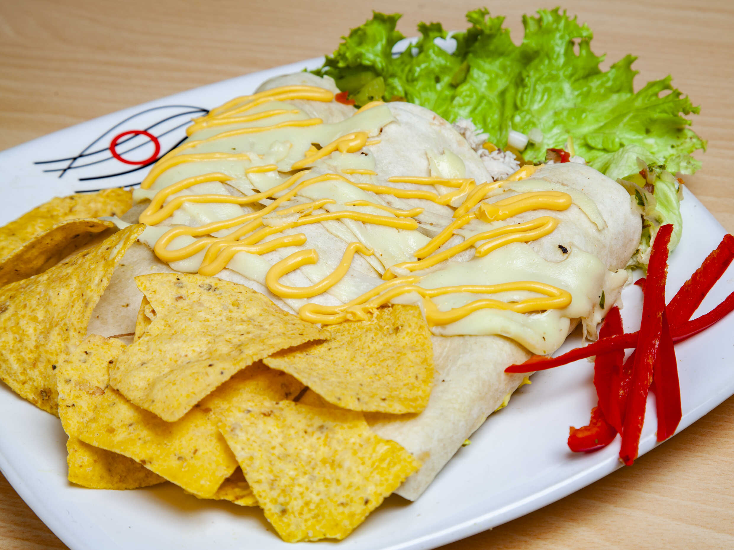 3 Deliciosos burritos con tortilla de trigo, carne, queso, frijol, lechuga, pico e gallo, guacamole y totopos.