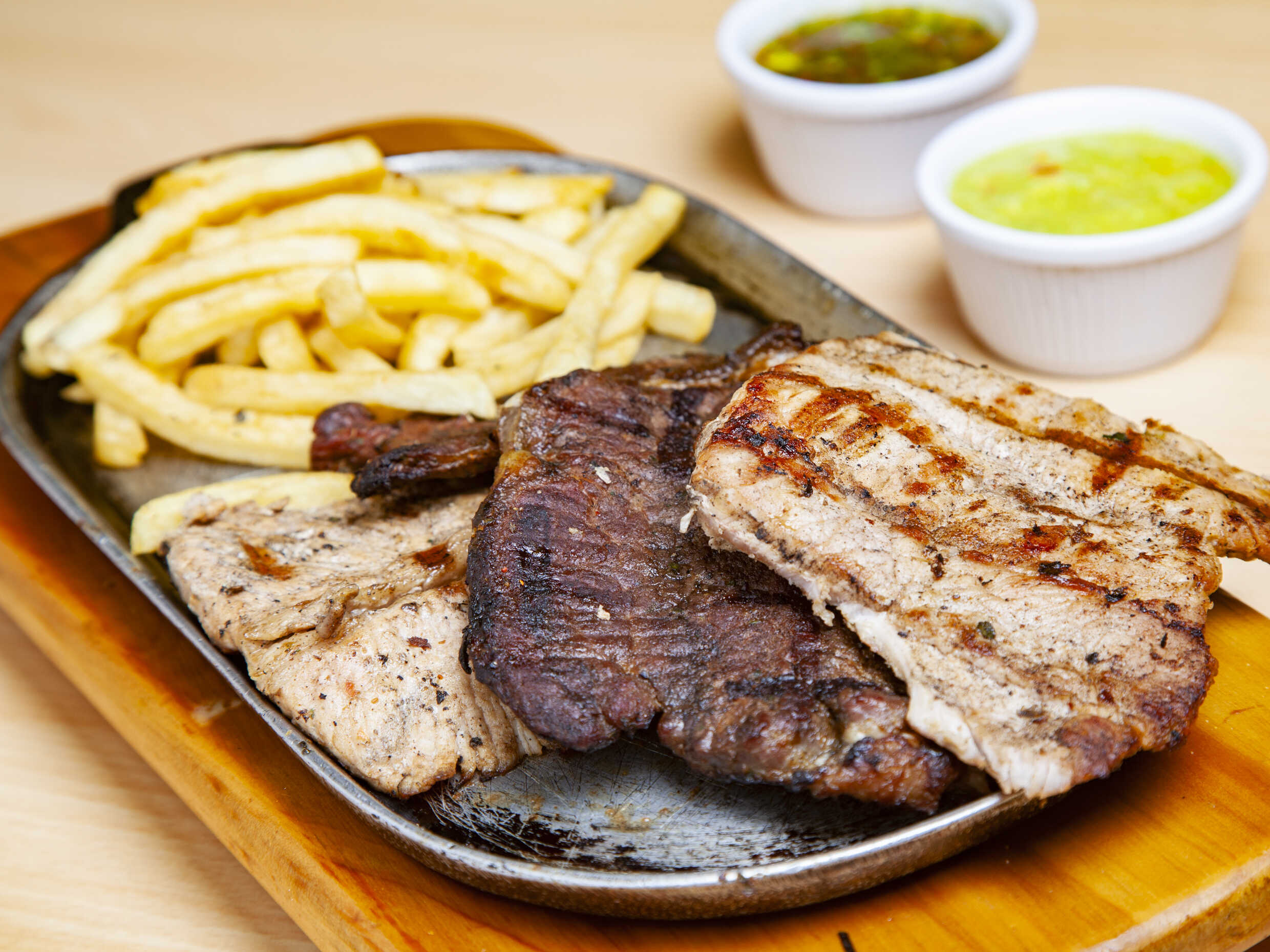 Tabla con res, pollo y cerdo, papa criolla, guacamole y chimichurry