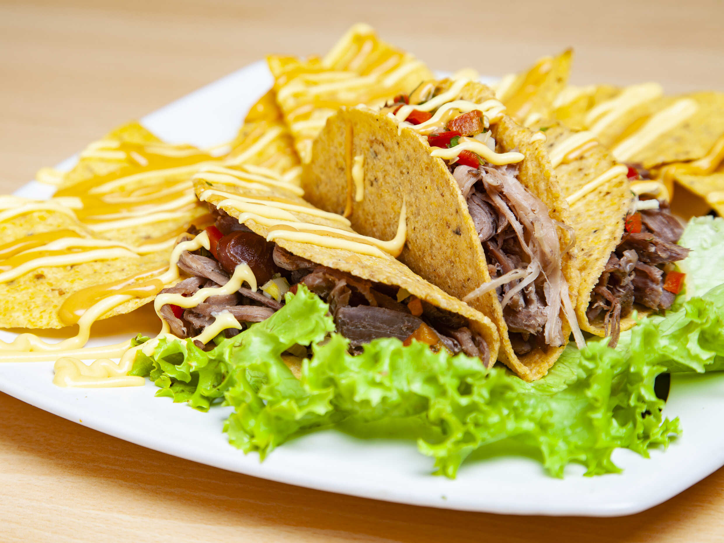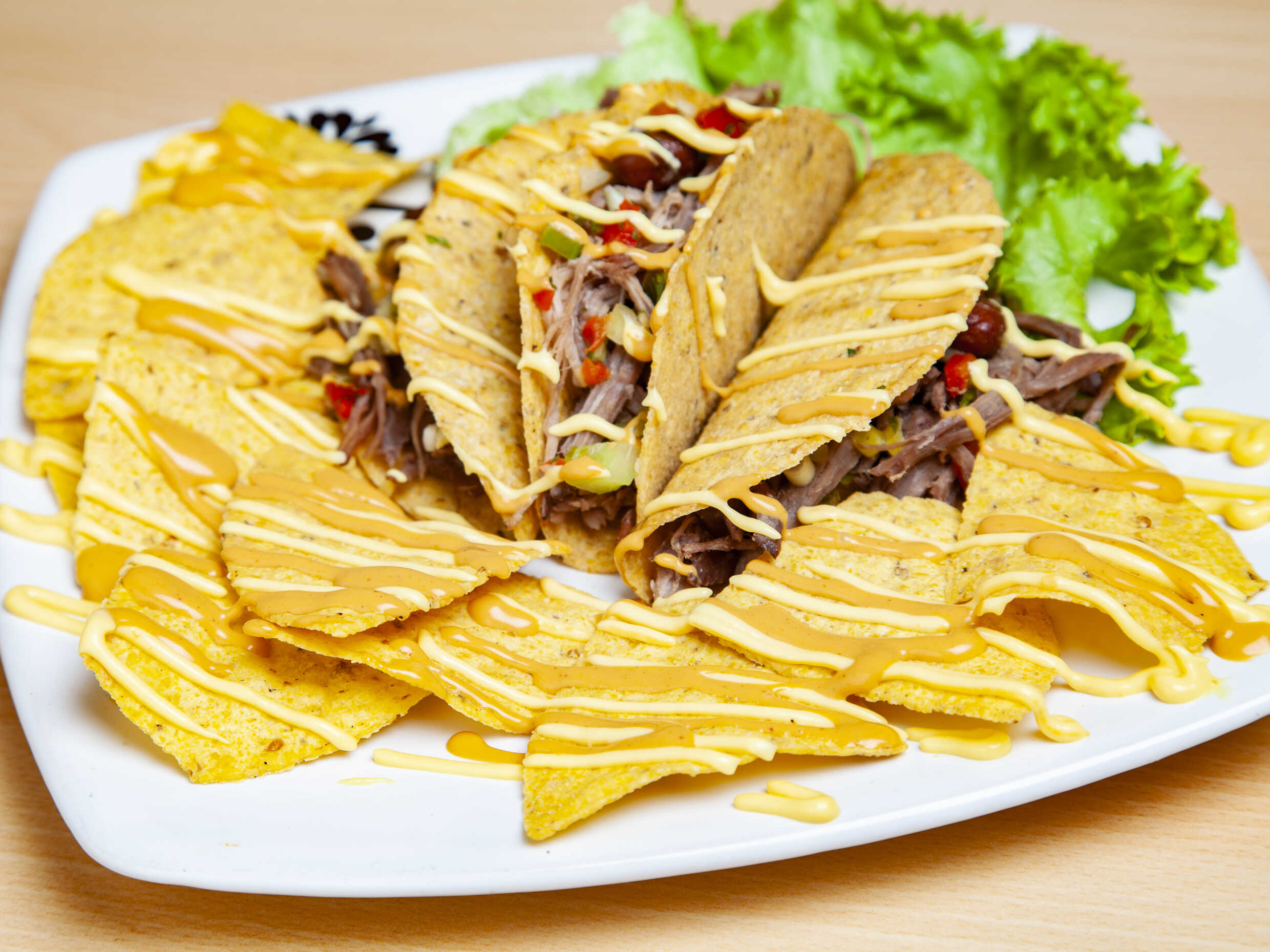 3 Deliciosos tacos de carne con tortilla de maíz, queso, frijol, lechuga, pico e gallo, guacamole y totopos.