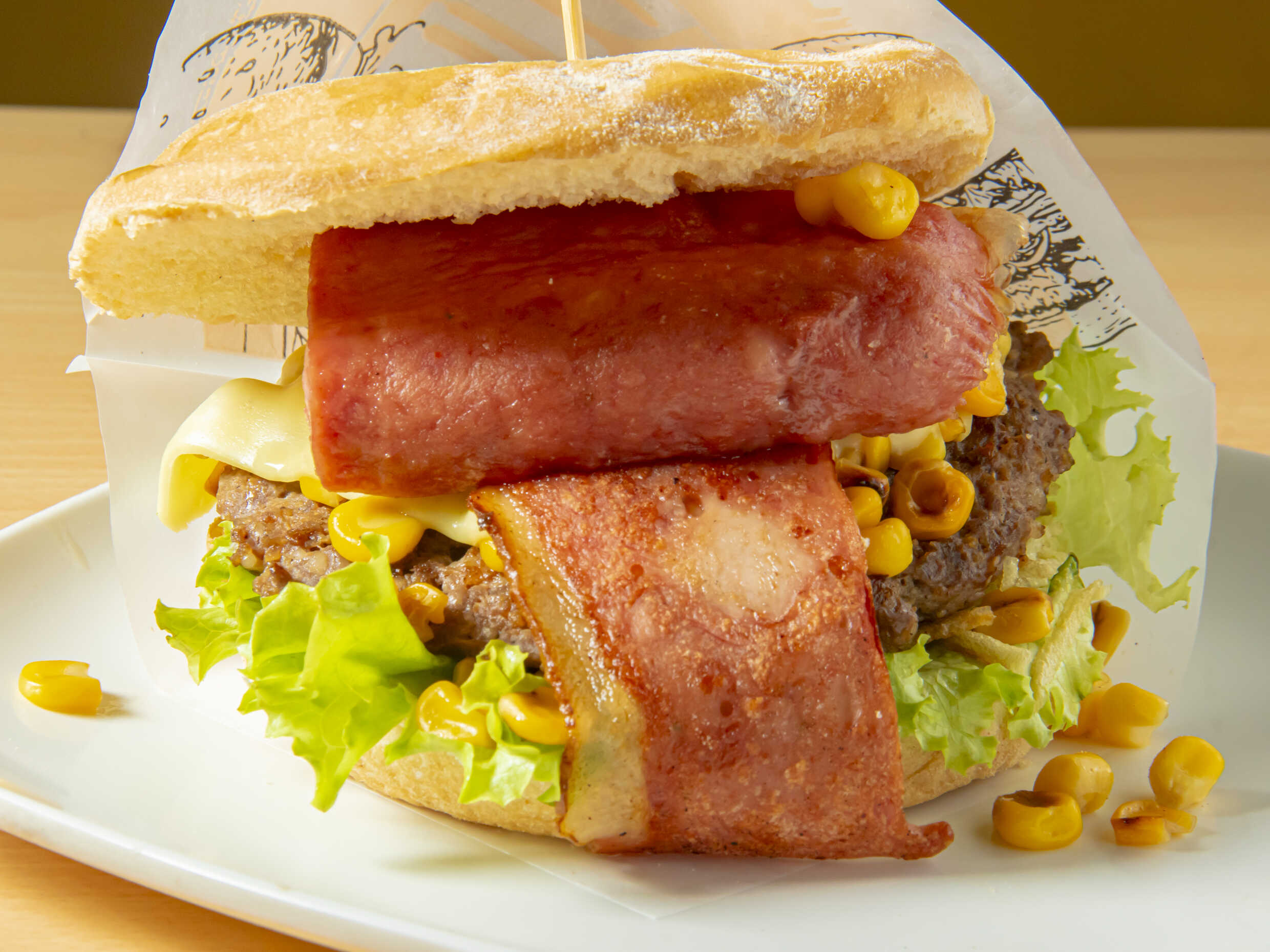 Un cuarto de carne 100% de res, chorizo, tocineta, pan, cebolla caramelizada, lechuga, tomate, queso, mazorca y papa chips.