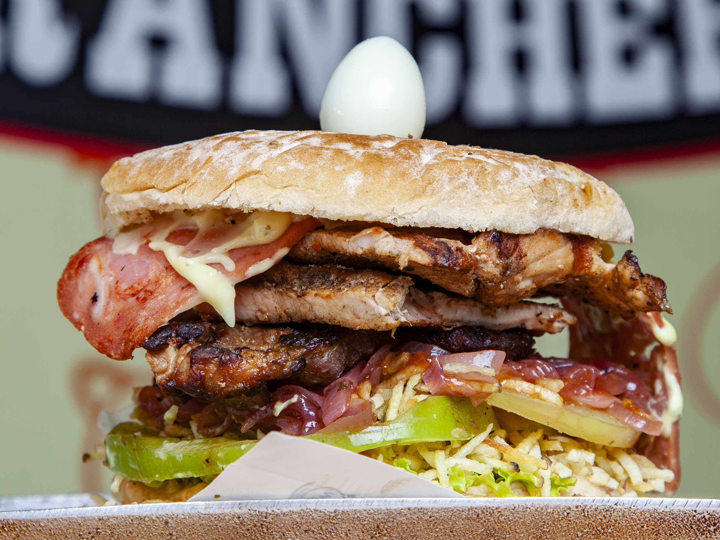 Un cuarto de carne de la casa, pechuga, lomo de cerdo, pan, cebolla caramelizada, queso, tocineta, champiñones, huevo de codorniz, lechuga, tomate y salsa de la casa.