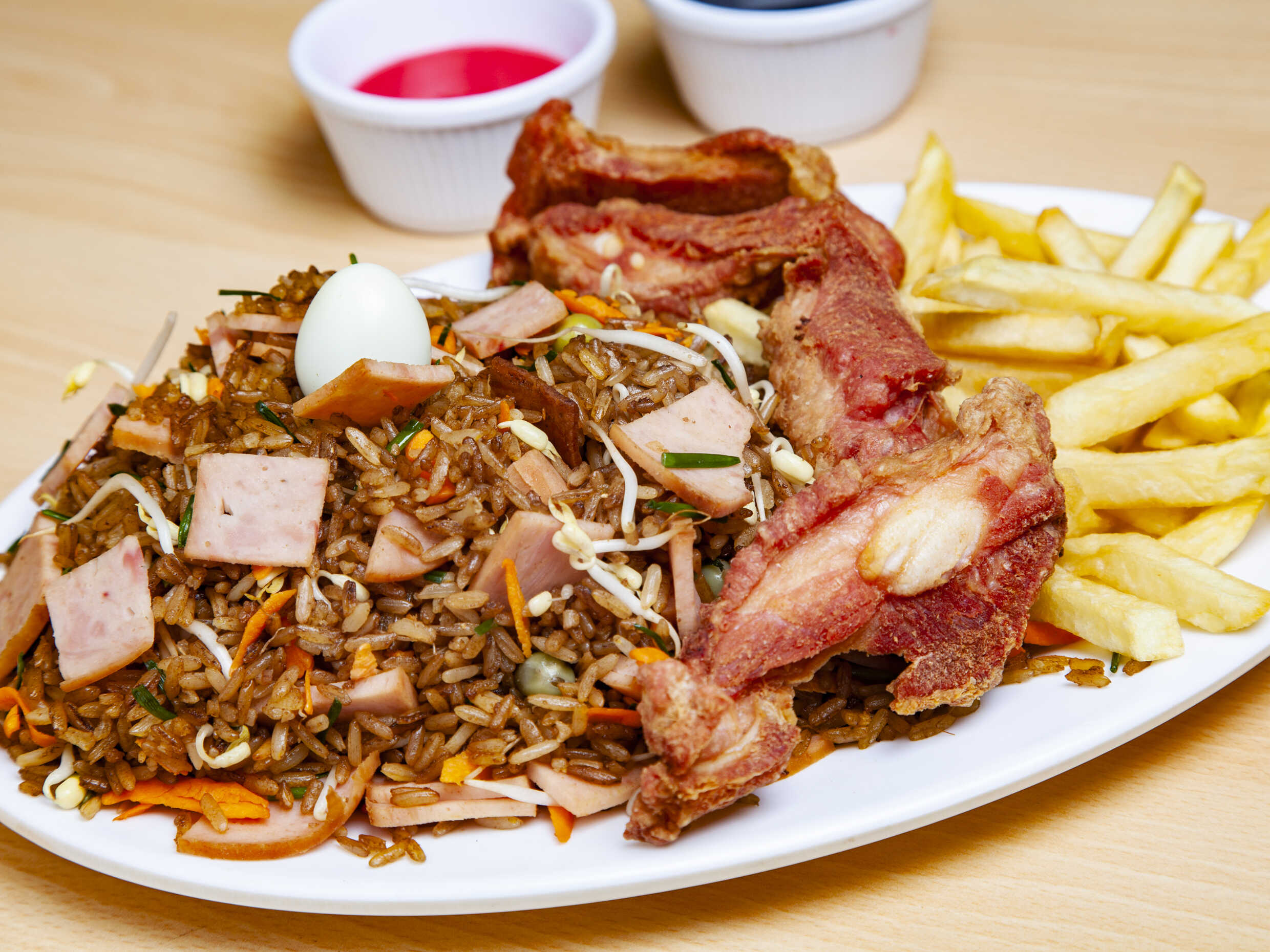 Porcion de arroz chino, acompañado de papas a la francesa y costillitas.