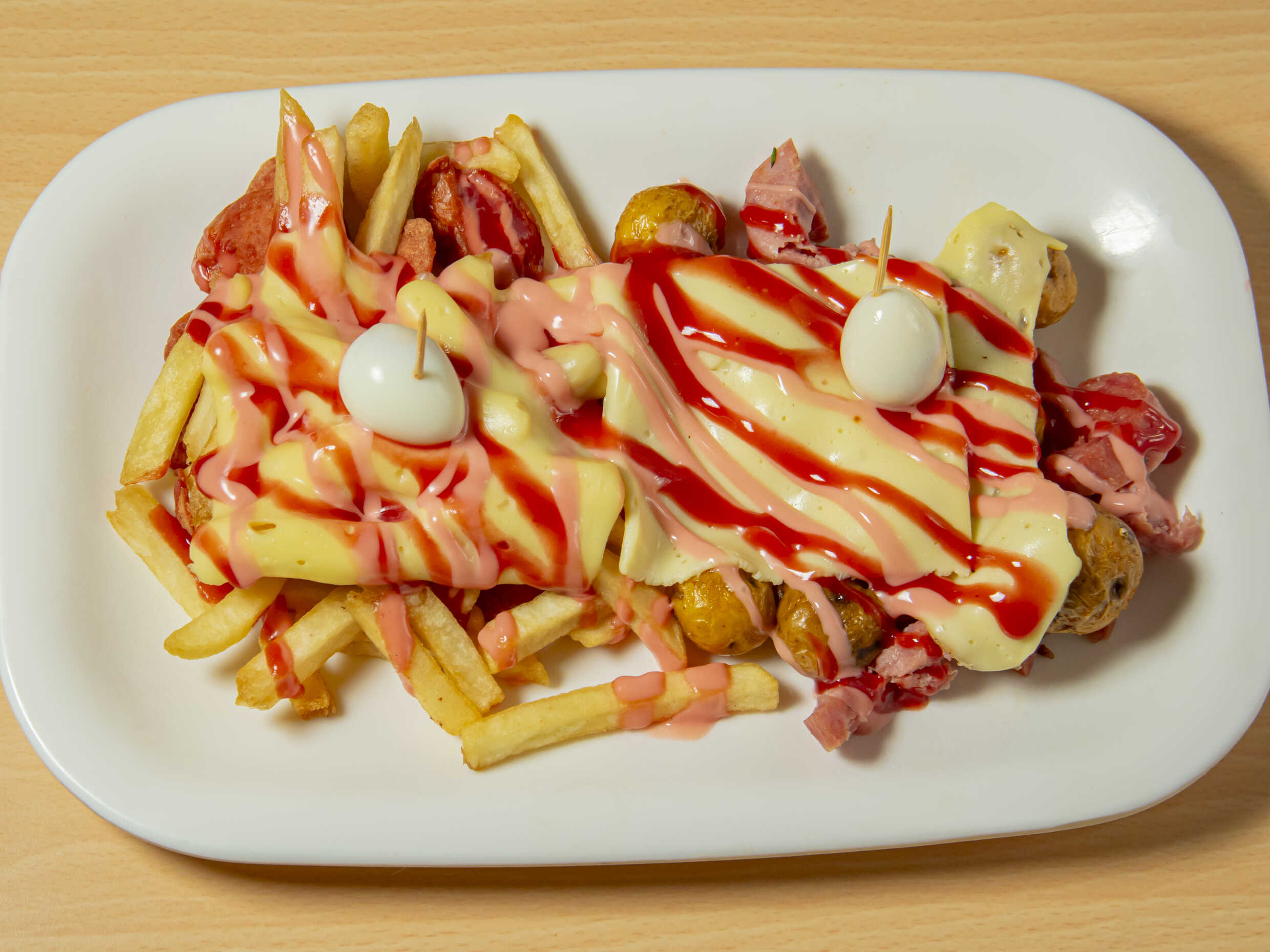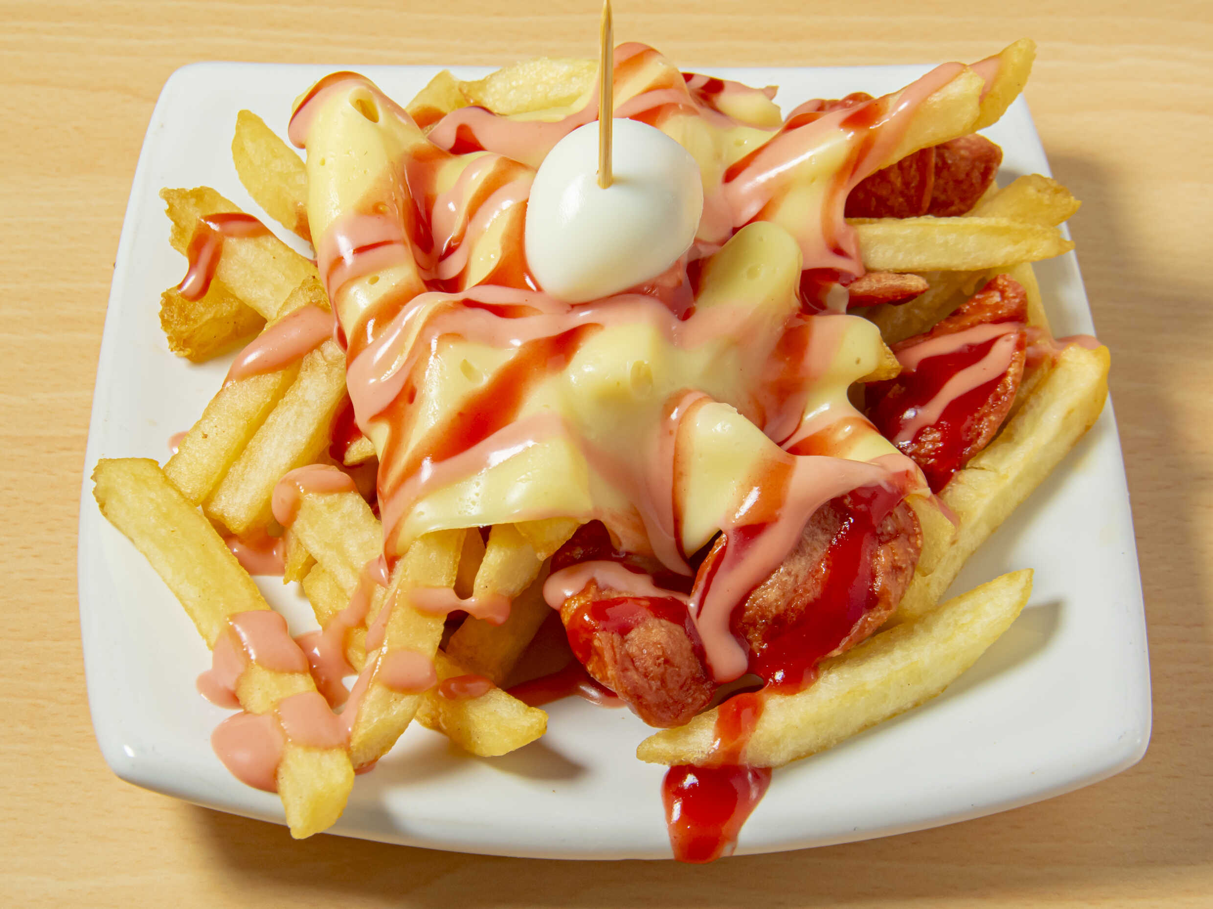 Salchicha americana, papa a la francesa, queso, y huevo de codorniz