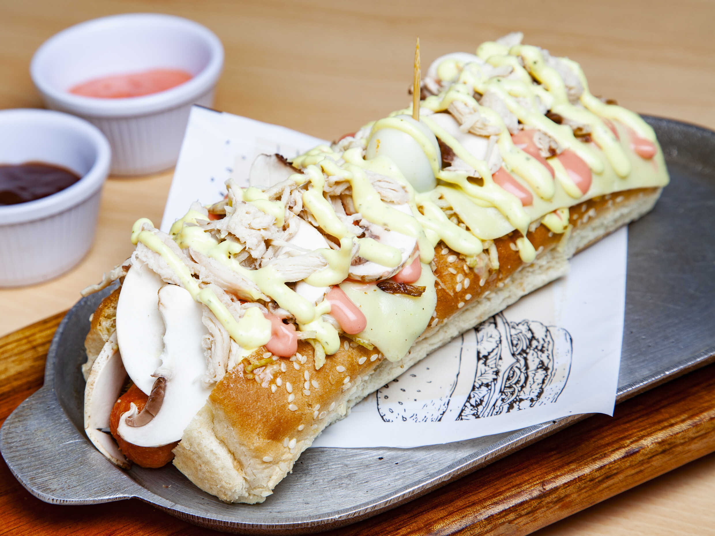 Pan, Salchicha Americana, carne desmechada, pollo, maiz, jamon, papa chips, queso y salsas.