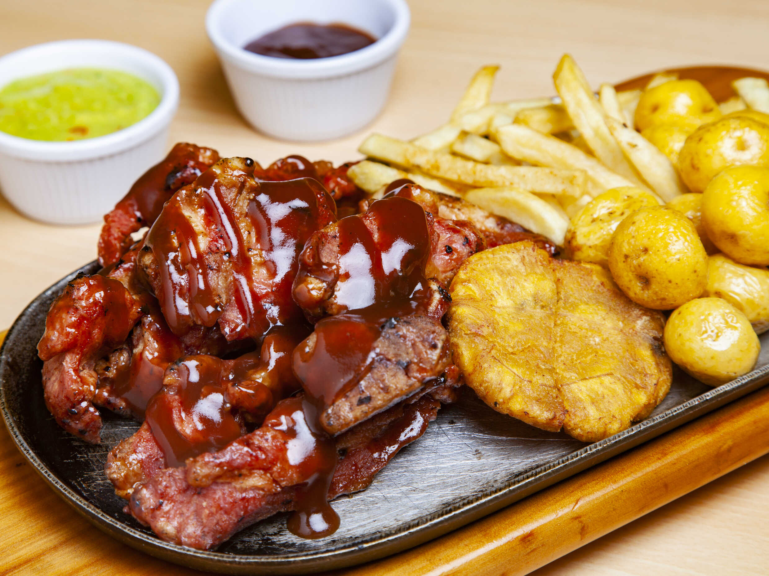 500 Gr de costillas de cerdo, papa a tu eleccion y patacon.