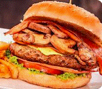 Un cuarto de carne 100% de res, pan, pollo, champiñones, cebolla caramelizada, lechuga, tomate, queso, papa chips con papas a la francesa y gaseosa 350 ml (Coca Cola, Manzana, Colombiana o limonada 350 ml).