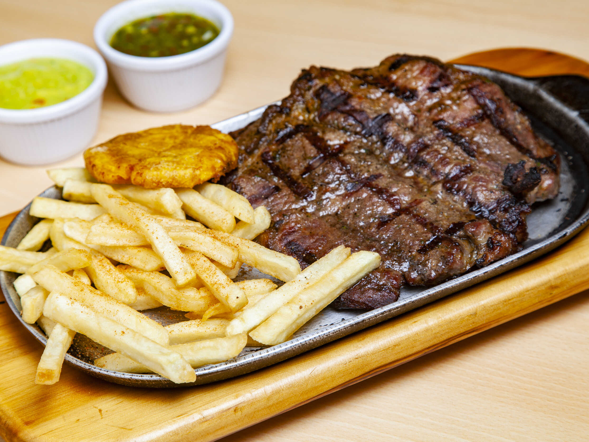 360 Gramos de churrasco , papa salada, guacamole, patacon y chimichurri.
